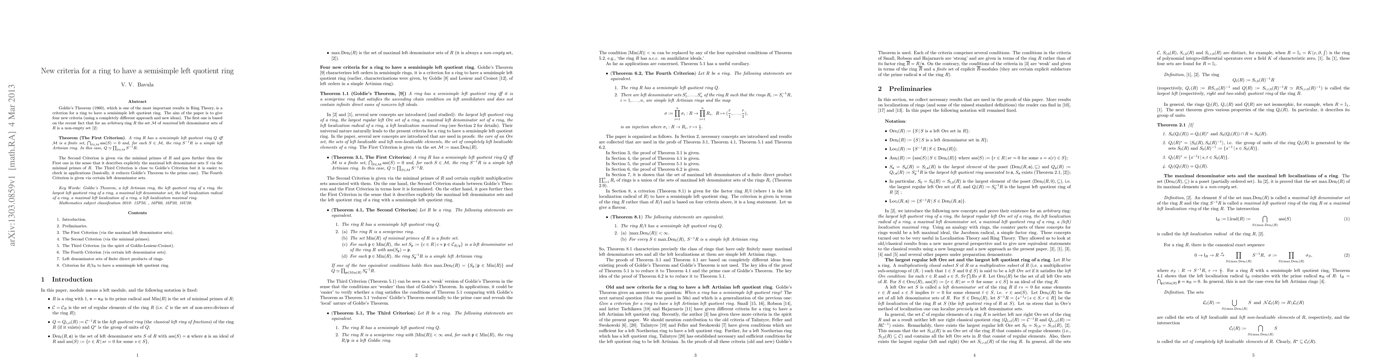 Researchers present four new criteria for a ring to have a semisimple left quotient ring, providing an alternative approach to Goldie's Theorem.