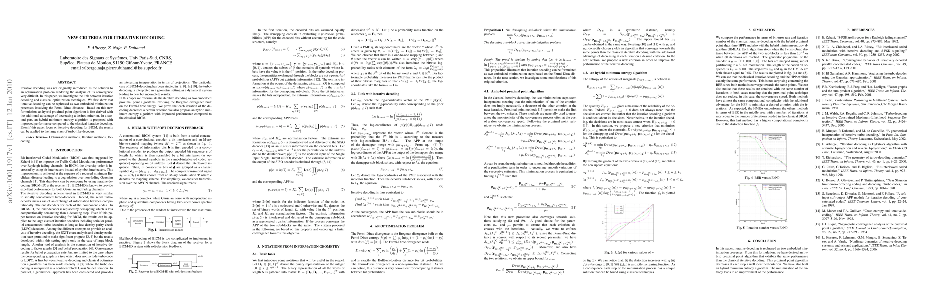 Iterative decoding was not originally introduced as the solution to an optimization problem rendering the analysis of its convergence very difficult. In this paper, we investigate the link between iterative decoding and classical optimization techniques. We first show that iterative decoding can be rephrased as two embedded minimization processes involving the Fermi-Dirac distance. Based on this new formulation, an hybrid proximal point algorithm is first derived with the additional advantage of decreasing a desired criterion. In a second part, an hybrid minimum entropy algorithm is proposed with improved performance compared to the classical iterative decoding. Even if this paper focus on iterative decoding for BICM, the results can be applied to the large class of turbo-like decoders.