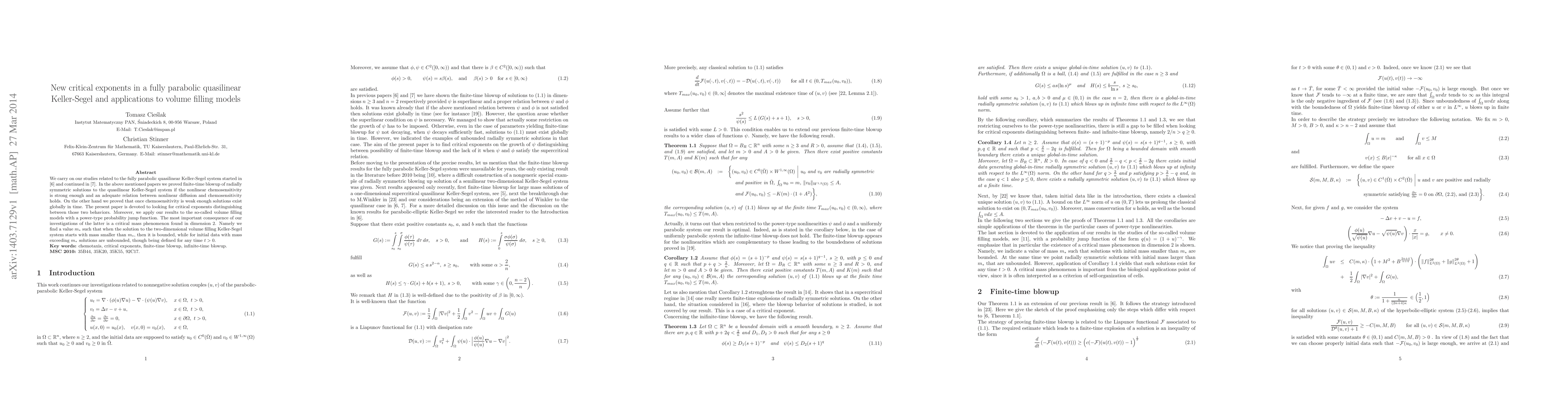 This paper identifies critical exponents in the fully parabolic quasilinear Keller-Segel system, distinguishing between finite-time blowup and global existence of solutions based on chemosensitivity strength. It also applies these findings to volume filling models, revealing a critical mass phenomenon in two dimensions where solutions are bounded if initial mass is below a threshold, but become unbounded if above.