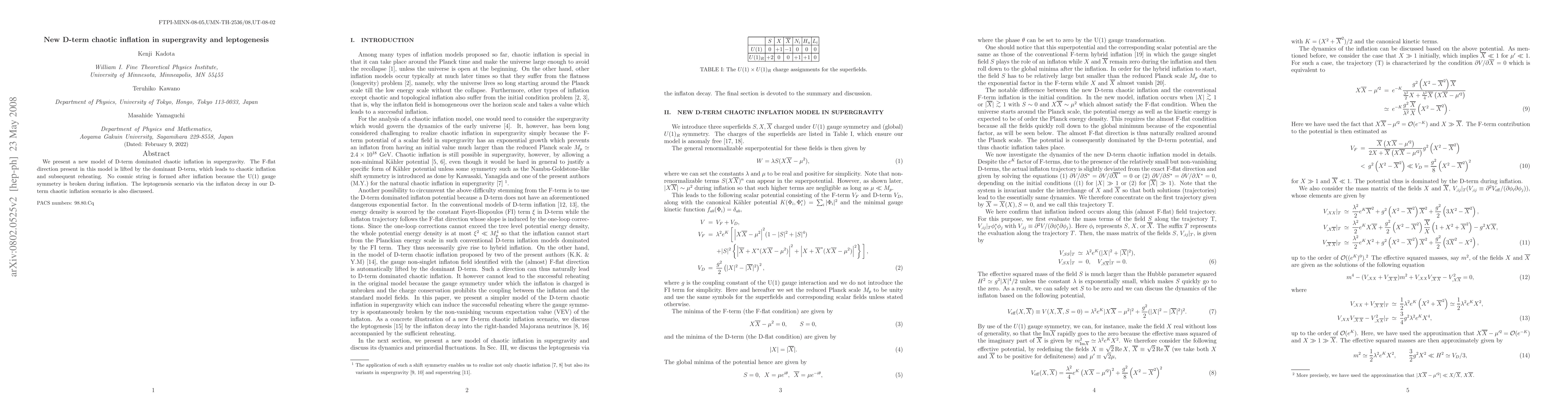 This paper proposes a new supergravity model for D-term dominated chaotic inflation, where the F-flat direction is lifted by a dominant D-term, avoiding cosmic strings due to broken U(1) symmetry. It also explores leptogenesis through inflaton decay post-inflation.