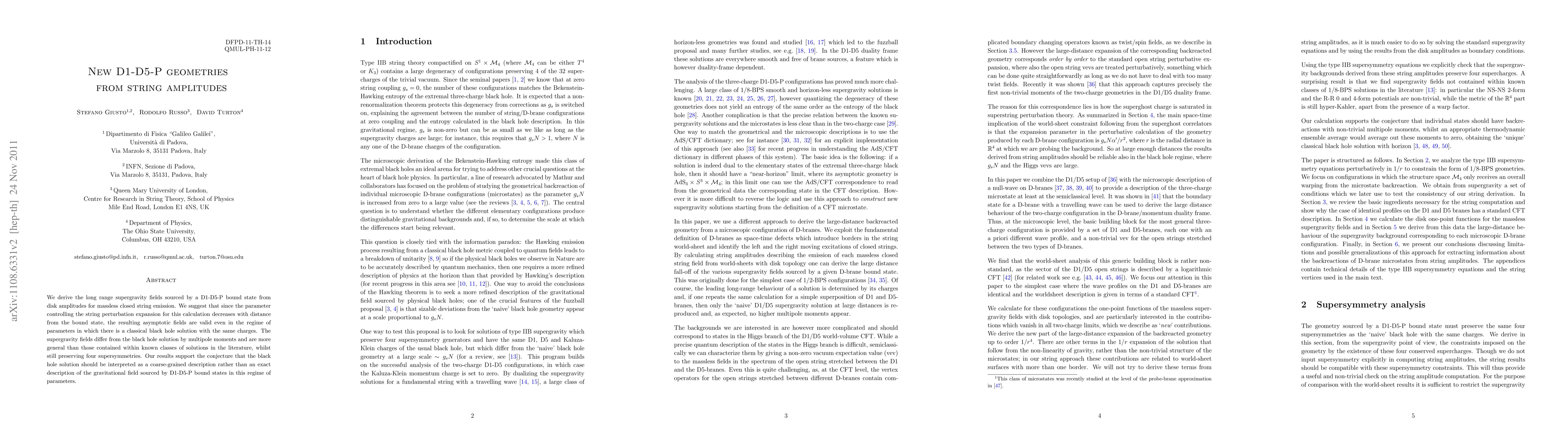We derive the long range supergravity fields sourced by a D1-D5-P bound state from disk amplitudes for massless closed string emission. We suggest that since the parameter controlling the string perturbation expansion for this calculation decreases with distance from the bound state, the resulting asymptotic fields are valid even in the regime of parameters in which there is a classical black hole solution with the same charges. The supergravity fields differ from the black hole solution by multipole moments and are more general than those contained within known classes of solutions in the literature, whilst still preserving four supersymmetries. Our results support the conjecture that the black hole solution should be interpreted as a coarse-grained description rather than an exact description of the gravitational field sourced by D1-D5-P bound states in this regime of parameters.