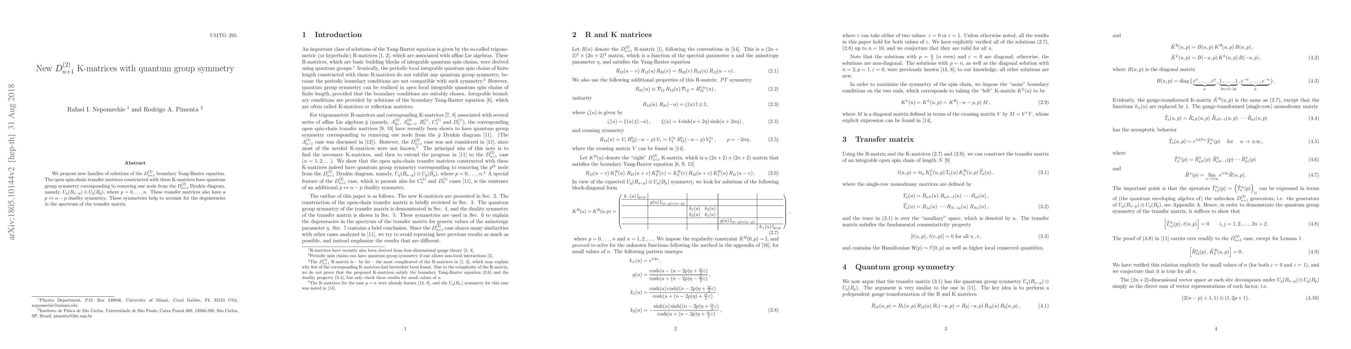 We find new families of solutions of the $D_{n+1}^{(2)}$ boundary Yang-Baxter equation. The open spin-chain transfer matrices constructed with these K-matrices have quantum group symmetry corresponding to removing one node from the $D_{n+1}^{(2)}$ Dynkin diagram, namely, $U_{q}(B_{n-p}) \otimes U_{q}(B_{p})$, where $p=0, \ldots, n$. These transfer matrices also have a $p \leftrightarrow n-p$ duality symmetry. These symmetries help to account for the degeneracies in the spectrum of the transfer matrix.