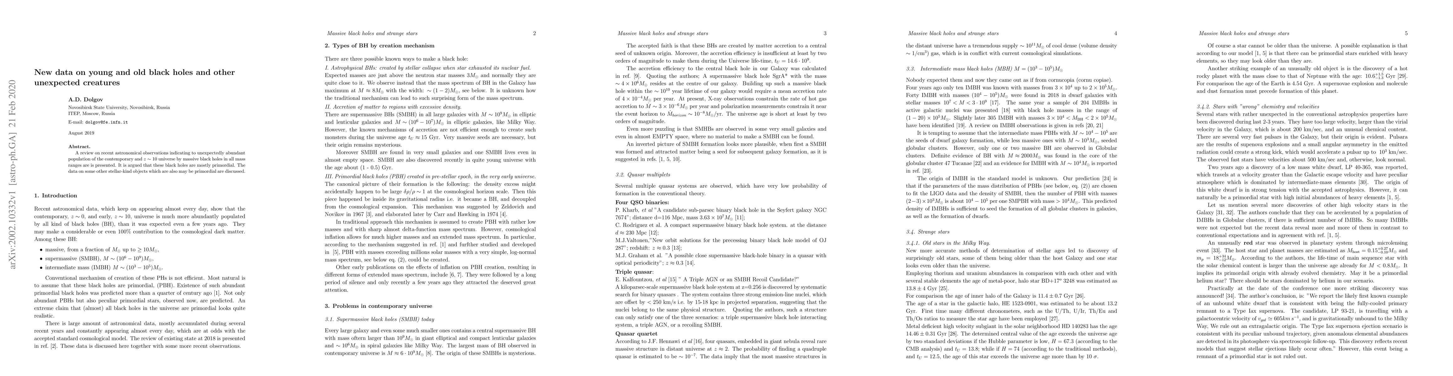 A review on recent astronomical observations indicating to unexpectedly abundant population of the contemporary and $ z \sim 10 $ universe by massive black holes in all mass ranges are is presented. It is argued that these black holes are mostly primordial. The data on some other stellar-kind objects which are also may be primordial are discussed.
