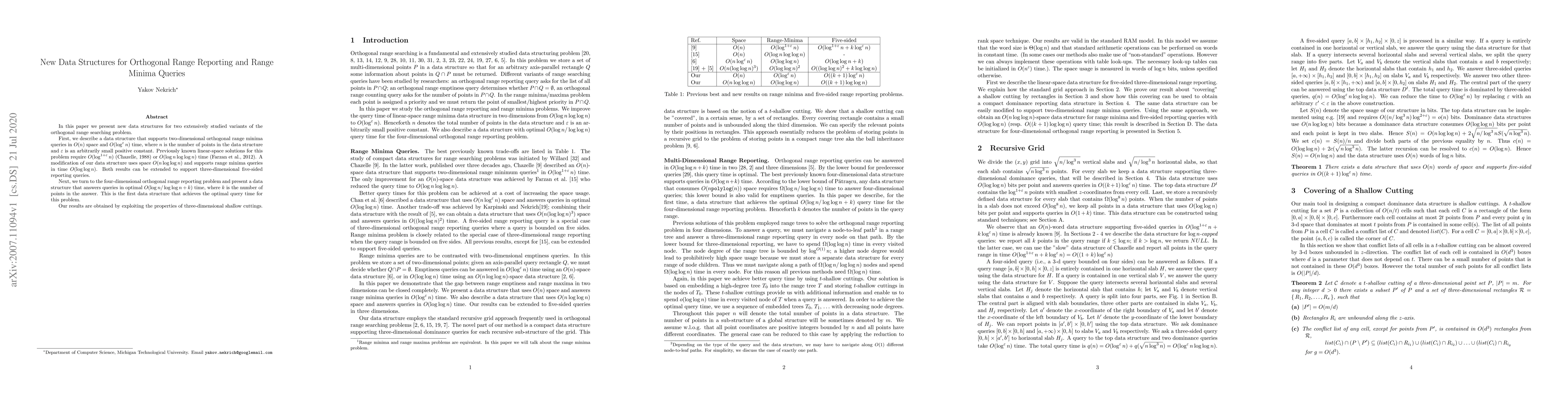 In this paper we present new data structures for two extensively studied variants of the orthogonal range searching problem. First, we describe a data structure that supports two-dimensional orthogonal range minima queries in $O(n)$ space and $O(\log^{\varepsilon} n)$ time, where $n$ is the number of points in the data structure and $\varepsilon$ is an arbitrarily small positive constant. Previously known linear-space solutions for this problem require $O(\log^{1+\varepsilon} n)$ (Chazelle, 1988) or $O(\log n\log \log n)$ time (Farzan et al., 2012). A modification of our data structure uses space $O(n\log \log n)$ and supports range minima queries in time $O(\log \log n)$. Both results can be extended to support three-dimensional five-sided reporting queries. Next, we turn to the four-dimensional orthogonal range reporting problem and present a data structure that answers queries in optimal $O(\log n/\log \log n + k)$ time, where $k$ is the number of points in the answer. This is the first data structure that achieves the optimal query time for this problem. Our results are obtained by exploiting the properties of three-dimensional shallow cuttings.