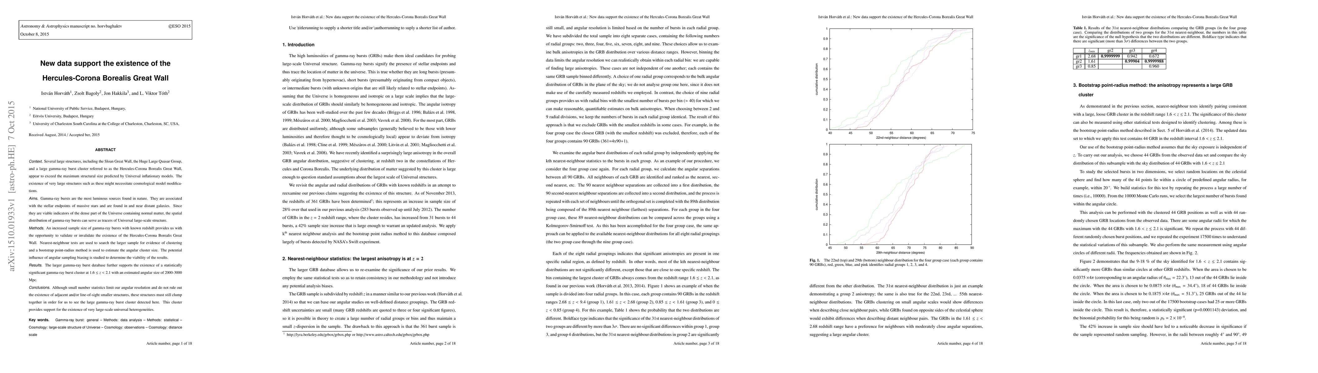 Several large structures, including the Sloan Great Wall, the Huge Large Quasar Group, and a large gamma-ray burst cluster referred to as the Hercules-Corona Borealis Great Wall, appear to exceed the maximum structural size predicted by Universal inflationary models. The existence of very large structures such as these might necessitate cosmological model modifications. Gamma-ray bursts are the most luminous sources found in nature. They are associated with the stellar endpoints of massive stars and are found in and near distant galaxies. Since they are viable indicators of the dense part of the Universe containing normal matter, the spatial distribution of gamma-ray bursts can serve as tracers of Universal large-scale structure. An increased sample size of gamma-ray bursts with known redshift provides us with the opportunity to validate or invalidate the existence of the Hercules-Corona Borealis Great Wall. Nearest-neighbour tests are used to search the larger sample for evidence of clustering and a bootstrap point-radius method is used to estimate the angular cluster size. The potential influence of angular sampling biasing is studied to determine the viability of the results. The larger gamma-ray burst database further supports the existence of a statistically significant gamma-ray burst cluster at 1.6 < z < 2.1 with an estimated angular size of 2000-3000 Mpc. Although small number statistics limit our angular resolution and do not rule out the existence of adjacent and/or line-of-sight smaller structures, these structures must still clump together in order for us to see the large gamma-ray burst cluster detected here. This cluster provides support for the existence of very large-scale universal heterogeneities.
