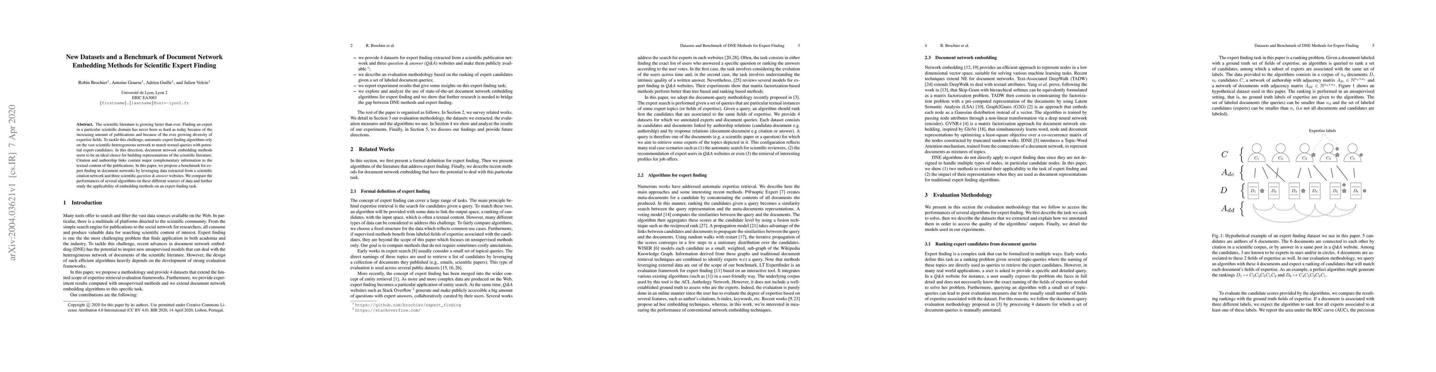 The scientific literature is growing faster than ever. Finding an expert in a particular scientific domain has never been as hard as today because of the increasing amount of publications and because of the ever growing diversity of expertise fields. To tackle this challenge, automatic expert finding algorithms rely on the vast scientific heterogeneous network to match textual queries with potential expert candidates. In this direction, document network embedding methods seem to be an ideal choice for building representations of the scientific literature. Citation and authorship links contain major complementary information to the textual content of the publications. In this paper, we propose a benchmark for expert finding in document networks by leveraging data extracted from a scientific citation network and three scientific question & answer websites. We compare the performances of several algorithms on these different sources of data and further study the applicability of embedding methods on an expert finding task.