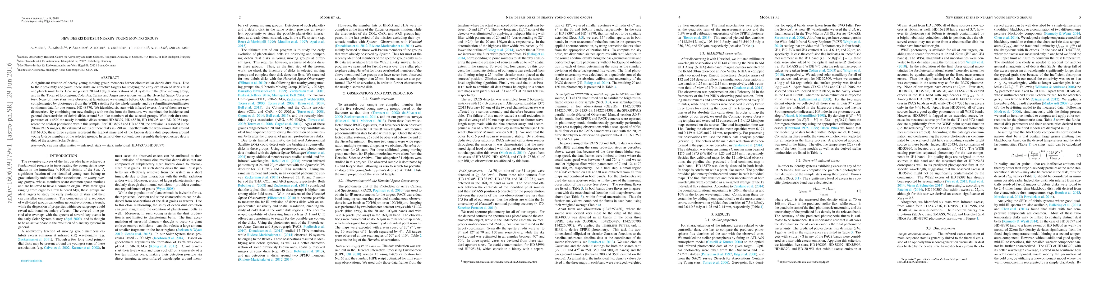 This paper reports on Herschel Space Observatory observations of 31 young stars in nearby moving groups, identifying six with infrared excess indicative of debris disks, including four new discoveries. The study highlights the coldest debris disks around HD 38397, HD 48370, HD 160305, and BD-20 951, suggesting they resemble the ancient Solar System's debris disk.