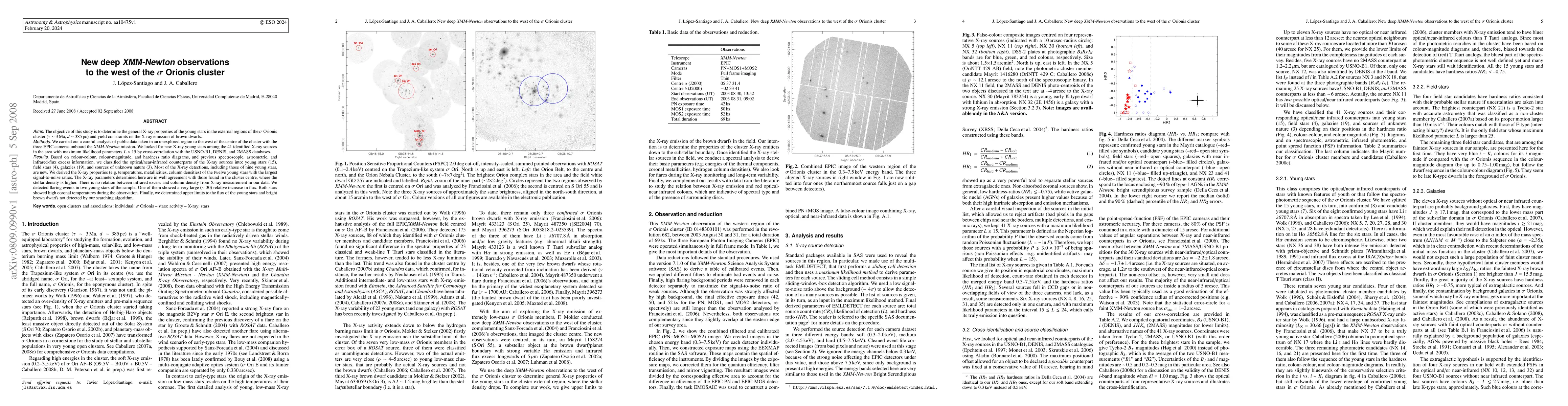 Aims: The objective of this study is to determine the general X-ray properties of the young stars in the external regions of the sigma Orionis cluster (tau ~ 3 Ma, d ~ 385 pc) and yield constraints on the X-ray emission of brown dwarfs. Methods: We carried out a careful analysis of public data taken in an unexplored region to the west of the centre of the cluster with the three EPIC cameras onboard the XMM-Newton mission. We looked for new X-ray young stars among the 41 identified X-ray sources in the area with maximum likelihood parameters L > 15 by cross-correlation with the USNO-B1, DENIS, and 2MASS databases. Results: Based on colour-colour, colour-magnitude, and hardness ratio diagrams, and previous spectroscopic, astrometric, and infrared-flux excess information, we classified the optical/near-infrared counterparts of the X-ray sources into: young stars (15), field stars (4), galaxies (19), and sources of unknown nature (3). Most of the X-ray detections, including those of nine young stars, are new. We derived the X-ray properties (e.g. temperatures, metallicities, column densities) of the twelve young stars with the largest signal-to-noise ratios. The X-ray parameters determined here are in well agreement with those found in the cluster centre, where the stellar density is higher. There is no relation between infrared excess and column density from X-ray measurement in our data. We detected flaring events in two young stars of the sample. One of them showed a very large (~ 30) relative increase in flux. Both stars showed high coronal temperatures during the observation. Finally, we determined upper limits to the flux of the young stars and bright brown dwarfs not detected by our searching algorithm.