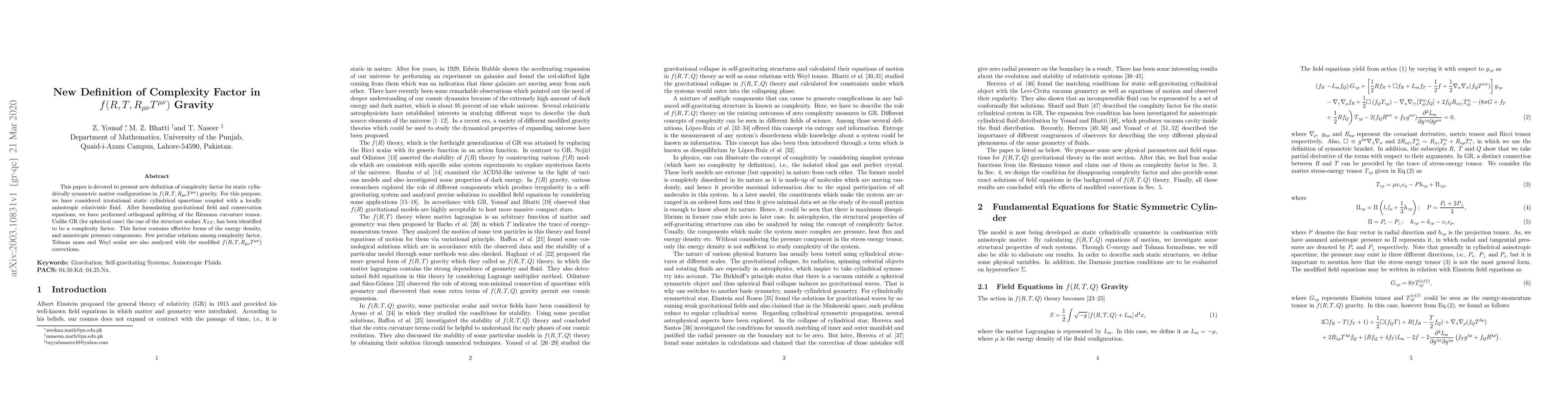 This paper introduces a new complexity factor in $f(R,T,R_{\mu\nu}T^{\mu\nu})$ gravity for static cylindrically symmetric matter configurations, identifying $X_{TF}$ as a complexity factor that incorporates energy density and anisotropic pressure components. The study also explores relationships between this factor, Tolman mass, and Weyl scalar under modified $f(R,T,R_{\mu\nu}T^{\mu\nu})$ corrections.