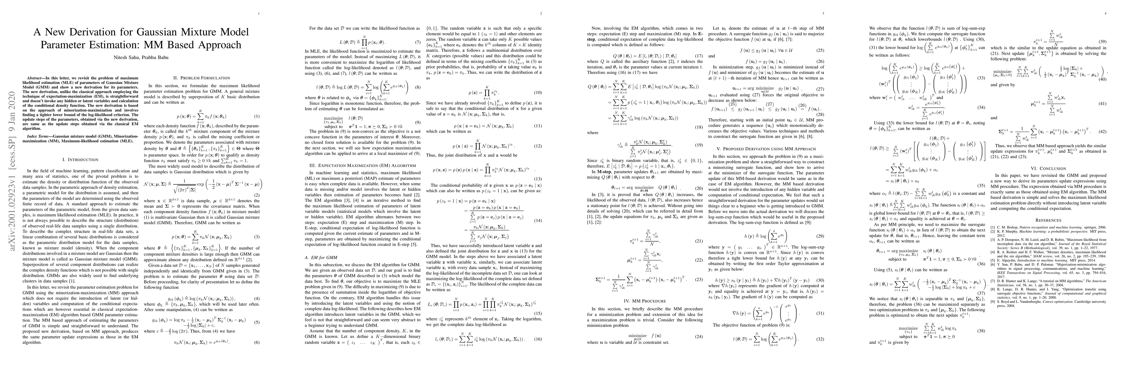 This paper presents a novel derivation for estimating parameters of Gaussian Mixture Models (GMM) using a minorization-maximization approach, avoiding the classical EM method and its latent variables. The new method finds a tighter lower bound of the log-likelihood, yielding parameter updates identical to those from the EM algorithm.