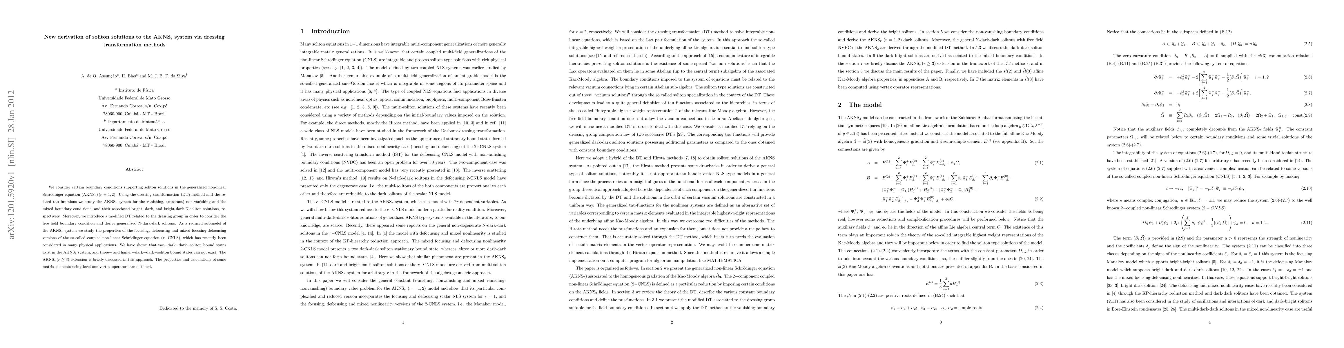 We consider certain boundary conditions supporting soliton solutions in the generalized non-linear Schr\"{o}dinger equation (AKNS$_r$)\,($r=1,2$). Using the dressing transformation (DT) method and the related tau functions we study the AKNS$_{r}$ system for the vanishing, (constant) non-vanishing and the mixed boundary conditions, and their associated bright, dark, and bright-dark N-soliton solutions, respectively. Moreover, we introduce a modified DT related to the dressing group in order to consider the free field boundary condition and derive generalized N-dark-dark solitons. As a reduced submodel of the AKNS$_r$ system we study the properties of the focusing, defocusing and mixed focusing-defocusing versions of the so-called coupled non-linear Schr\"{o}dinger equation ($r-$CNLS), which has recently been considered in many physical applications. We have shown that two$-$dark$-$dark$-$soliton bound states exist in the AKNS$_2$ system, and three$-$ and higher$-$dark$-$dark$-$soliton bound states can not exist. The AKNS$_r$\,($r\geq 3$) extension is briefly discussed in this approach. The properties and calculations of some matrix elements using level one vertex operators are outlined.