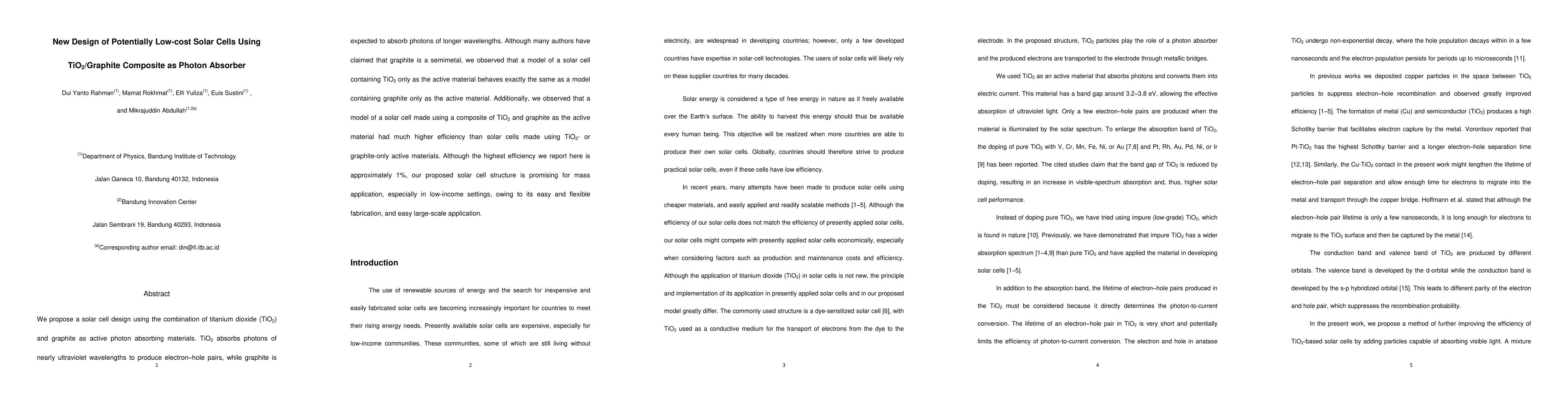 A solar cell design using the combination of titanium dioxide and graphite as active photon absorbing materials were proposed. The titanium dioxide absorbs photons of nearly ultraviolet wavelengths to produce electron hole pairs, while graphite is expected to absorb photons of longer wavelengths. Although many authors have claimed that graphite is not a semiconductor, we observed that a model of a solar cell containing titanium dioxide only as the active material behaves exactly the same as a model containing graphite only as the active material. Additionally, we observed that a model of a solar cell made using a composite of titanium dioxide and graphite as the active material had much higher efficiency than solar cells made using titanium dioxide only or graphite only active materials.