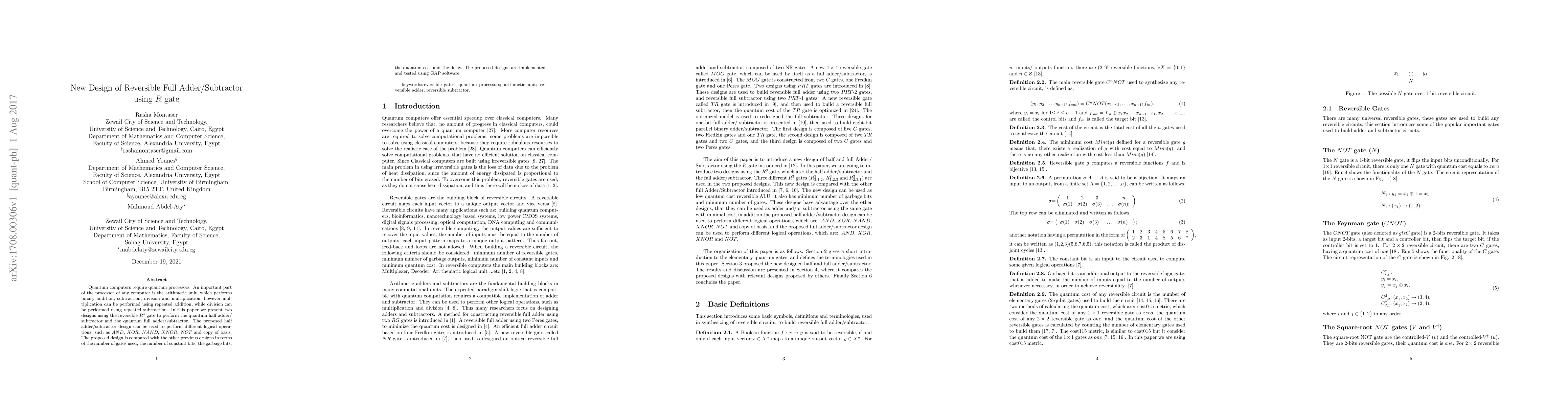 Quantum computers require quantum processors. An important part of the processor of any computer is the arithmetic unit, which performs binary addition, subtraction, division and multiplication, however multiplication can be performed using repeated addition, while division can be performed using repeated subtraction. In this paper we present two designs using the reversible $R^3$ gate to perform the quantum half adder/ subtractor and the quantum full adder/subtractor. The proposed half adder/subtractor design can be used to perform different logical operations, such as $AND$, $XOR$, $NAND$, $XNOR$, $NOT$ and copy of basis. The proposed design is compared with the other previous designs in terms of the number of gates used, the number of constant bits, the garbage bits, the quantum cost and the delay. The proposed designs are implemented and tested using GAP software.