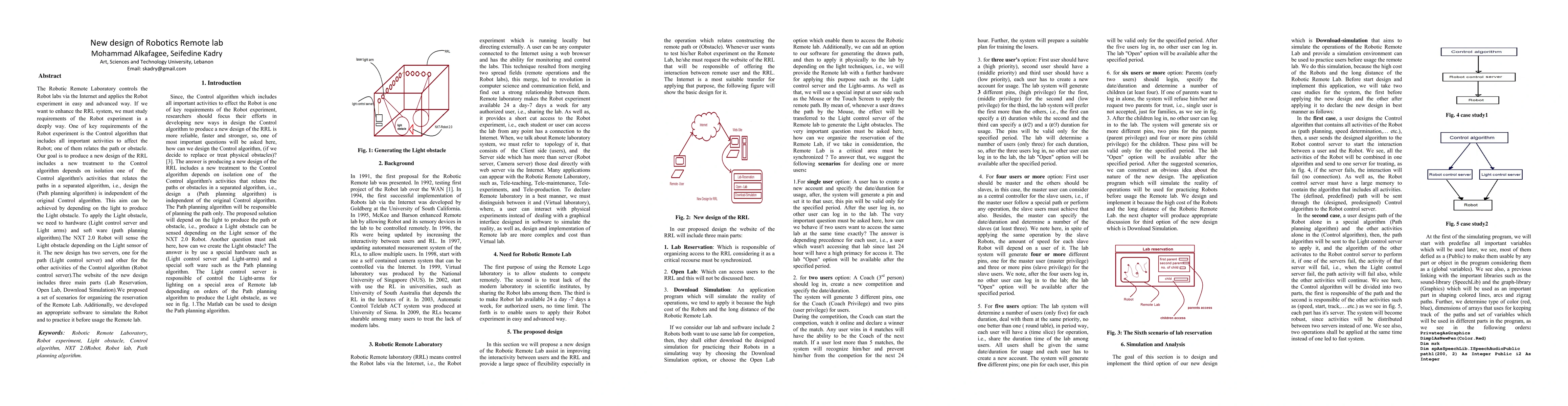The Robotic Remote Laboratory controls the Robot labs via the Internet and applies the Robot experiment in easy and advanced way. If we want to enhance the RRL system, we must study requirements of the Robot experiment in a deeply way. One of key requirements of the Robot experiment is the Control algorithm that includes all important activities to affect the Robot; one of them relates the path or obstacle. Our goal is to produce a new design of the RRL includes a new treatment to the Control algorithm depends on isolation one of the Control algorithm's activities that relates the paths in a separated algorithm, i.e., design the (Path planning algorithm) is independent of the original Control algorithm. This aim can be achieved by depending on the light to produce the Light obstacle. To apply the Light obstacle, we need to hardware (Light control server and Light arms) and soft ware (path planning algorithm).The NXT 2.0 Robot will sense the Light obstacle depending on the Light sensor of it. The new design has two servers, one for the path (Light control server) and other for the other activities of the Control algorithm (Robot control server).The website of the new design includes three main parts (Lab Reservation, Open Lab, Download Simulation).We proposed a set of scenarios for organizing the reservation of the Remote Lab. Additionally, we developed an appropriate software to simulate the Robot and to practice it before usage the Remote lab.