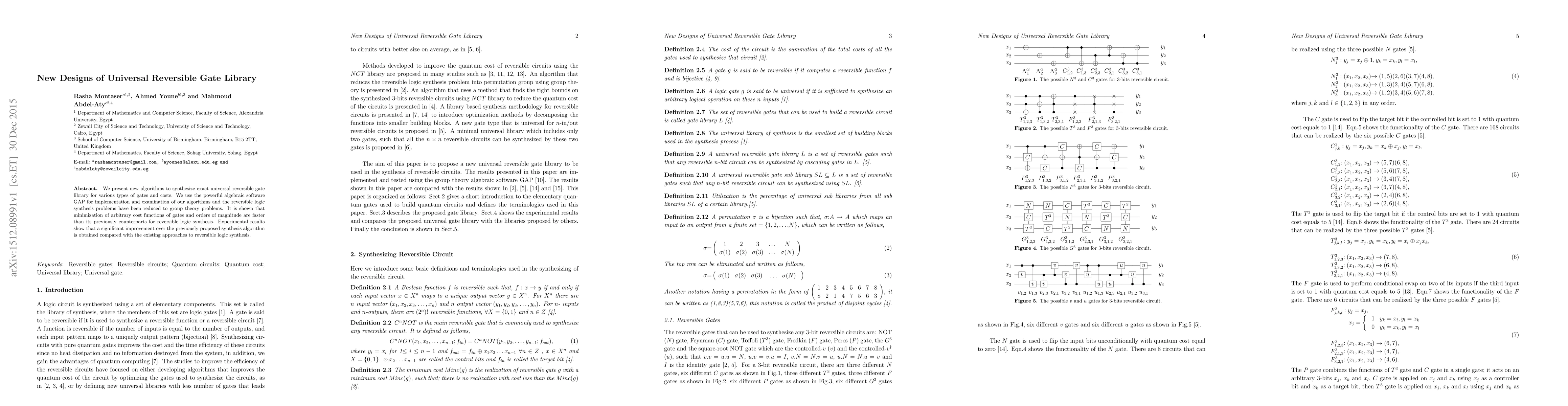 We present new algorithms to synthesize exact universal reversible gate library for various types of gates and costs. We use the powerful algebraic software GAP for implementation and examination of our algorithms and the reversible logic synthesis problems have been reduced to group theory problems. It is shown that minimization of arbitrary cost functions of gates and orders of magnitude are faster than its previously counterparts for reversible logic synthesis. Experimental results show that a significant improvement over the previously proposed synthesis algorithm is obtained compared with the existing approaches to reversible logic synthesis.
