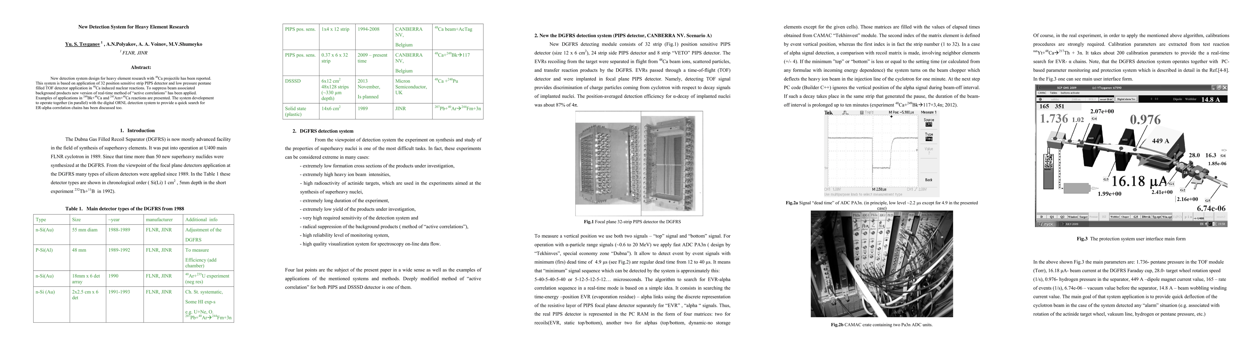 New detection system design for heavy element research with 48Ca projectile has been reported. This system is based on application of 32 position sensitive strip PIPS detector and low pressure pentane filled TOF detector application in 48Ca induced nuclear reactions. To suppress beam associated background products new version of real time method of active correlations has been applied. Examples of applications in 249Bk+48Ca and 243Am+48Ca reactions are presented. The system development to operate together with the digital ORNL detection system to provide a quick search for recoil to alpha correlation chains has been discussed too.