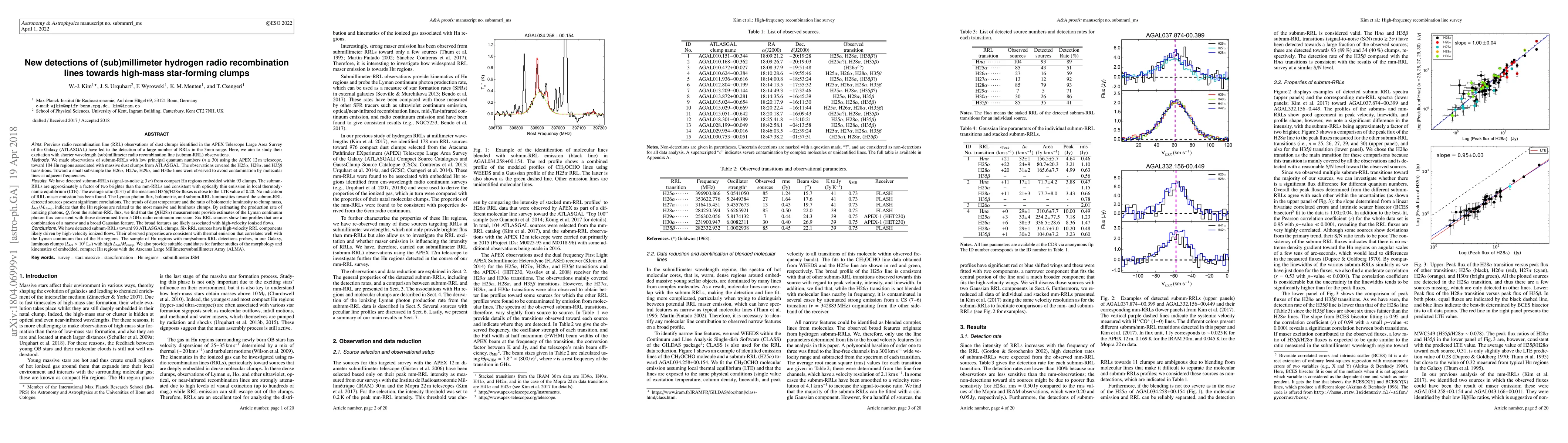 Previous radio recombination line (RRL) observations of dust clumps identified in the APEX Telescope Large Area Survey of the Galaxy (ATLASGAL) have led to the detection of a large number of RRLs in the 3mm range. Here, we aim to study their excitation with shorter wavelength (sub)millimeter radio recombination line (submm-RRL) observations. We made observations of submm-RRLs with low principal quantum numbers ($n$ $\leq$ 30) using the APEX 12 m telescope, toward 104 HII regions associated with massive dust clumps from ATLASGAL. The observations covered the H25$\alpha$, H28$\alpha$, and H35$\beta$ transitions. Toward a small subsample the H26$\alpha$, H27$\alpha$, H29$\alpha$, and H30$\alpha$ lines were observed to avoid contamination by molecular lines at adjacent frequencies. We have detected submm-RRLs (signal-to-noise $\geq$ 3 $\sigma$) from compact HII regions embedded within 93 clumps. The submm-RRLs are approximately a factor of two brighter than the mm-RRLs and consistent with optically thin emission in local thermodynamic equilibrium (LTE). The average ratio (0.31) of the measured H35$\beta$/H28$\alpha$ fluxes is close to the LTE value of 0.28. No indication of RRL maser emission has been found. The Lyman photon flux, bolometric, and submm-RRL luminosities toward the submm-RRL detected sources present significant correlations. The trends of dust temperature and the ratio of bolometric luminosity to clump mass, $L_{\rm bol}/M_{\rm clump}$, indicate that the HII regions are related to the most massive and luminous clumps. By estimating the production rate of ionizing photons, $Q$, from the submm-RRL flux, we find that the $Q$(H28$\alpha$) measurements provide estimates of the Lyman continuum photon flux consistent with those determined from 5 GHz radio continuum emission.