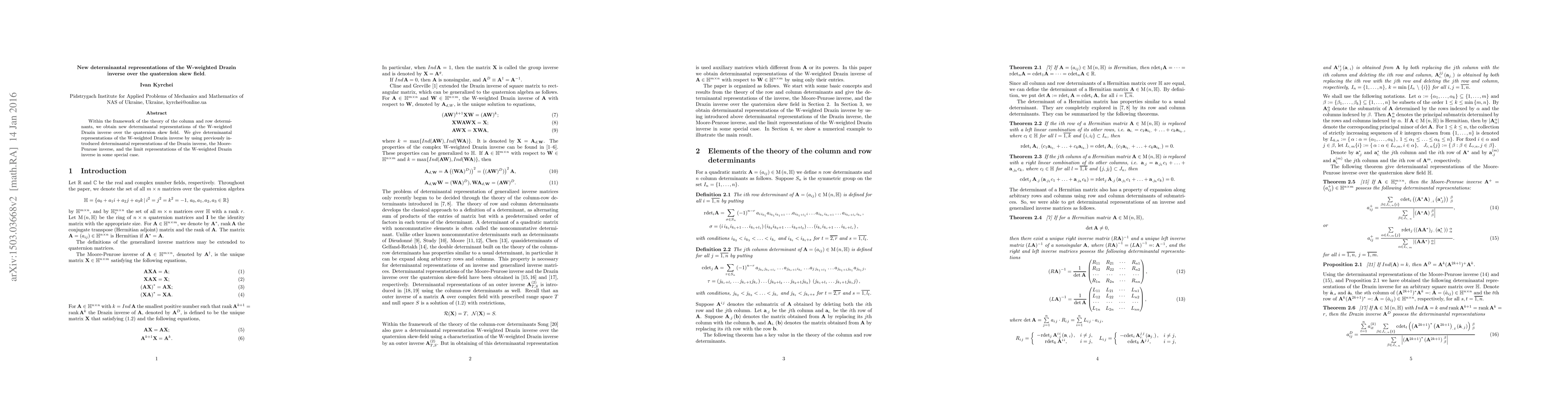 Summary: This paper develops new determinantal representations for the W-weighted Drazin inverse over the quaternion skew field, utilizing previously established determinantal representations of the Drazin inverse, Moore-Penrose inverse, and special limit representations.
