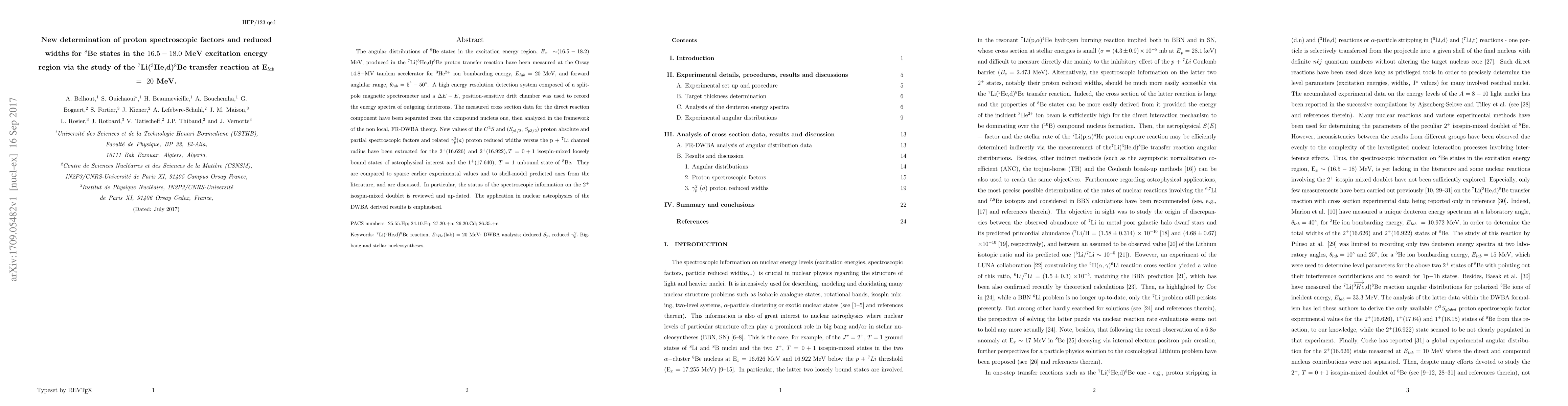 The angular distributions of $^{8}$Be states in the excitation energy region, E$_{x}$ $\ \sim$($16.5-18.2$) MeV, produced in the $^{7}$Li($^{3}% $He,d)$^{8}$Be proton transfer reaction have been measured at the Orsay 14.8$-$MV tandem accelerator for $^{3}$He$^{2+}$ ion bombarding energy, E$_{lab}$ $=20$ MeV, and forward anglular range, $\theta_{lab}=5^{\circ}-50^{\circ}$. A high energy resolution detection system composed of a split-pole magnetic spectrometer and a $\Delta E-E$,\ position-sensitive drift chamber was used to record the energy spectra of outgoing deuterons. The measured cross section data for the direct reaction component have been separated from the compound nucleus one, then analyzed in the framework of the non local, FR-DWBA theory. New values of the $C^{2}S$ and ($S_{p1/2},$ $S_{p3/2})$ proton absolute and partial spectroscopic factors and related $\gamma_{p}^{2}(a)$\ proton reduced widths versus the p $+$ $^{7}$Li channel radius have been extracted for the $2^{+}(16.626)$ and $2^{+}(16.922),T=0+1$ isospin-mixed loosely bound states of astrophysical interest and the $1^{+}(17.640)$, $T=1$ unbound state of $^{8}$Be. They are compared to sparse earlier experimental values and to shell-model predicted ones from the literature, and are discussed. In particular, the status of the spectroscopic information on the $2^{+}$ isospin-mixed doublet is reviewed and up-dated. The application in nuclear astrophysics of the DWBA derived results is emphasised.