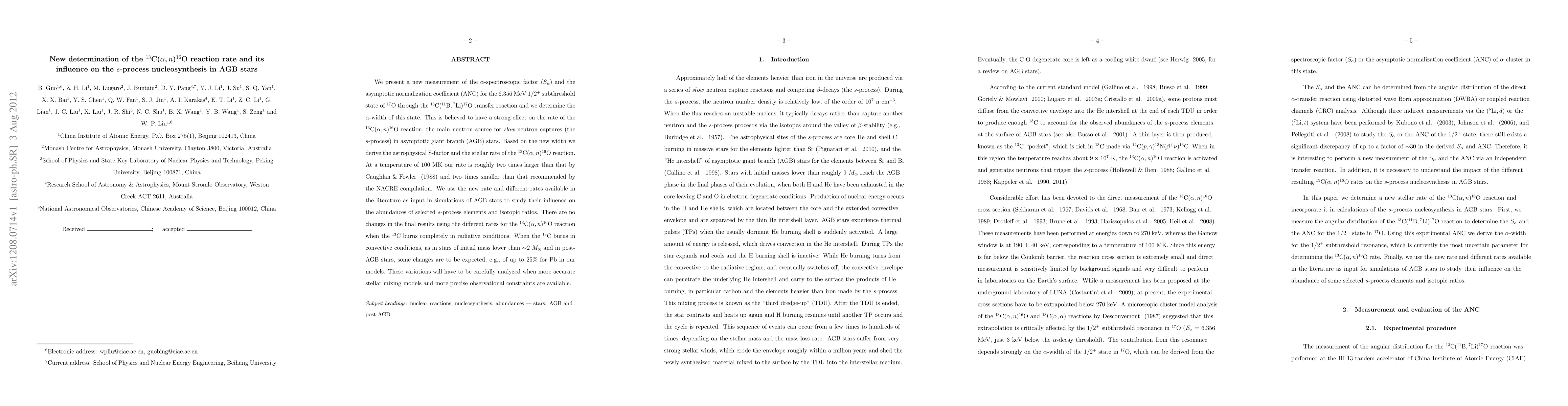 This paper reports a new measurement of the $\alpha$-width for the $^{13}$C($\alpha$, n)$^{16}$O reaction, which significantly influences the s-process nucleosynthesis in AGB stars. The new rate shows a mixed effect on the reaction rate compared to previous studies, potentially leading to up to 25% variations in Pb abundance in certain stellar conditions.