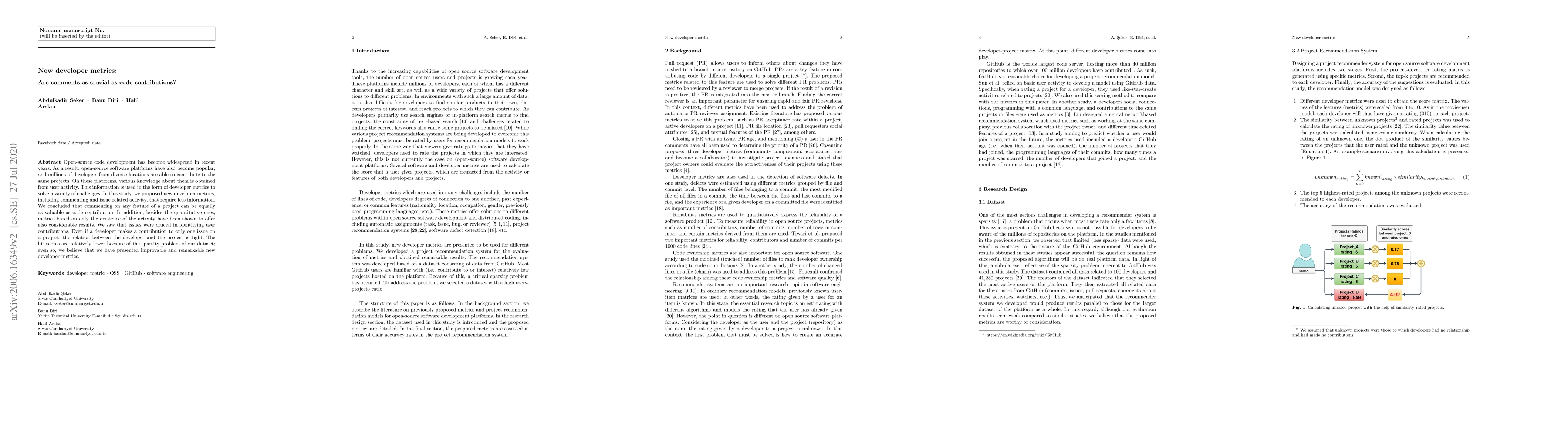 Open-source code development has become widespread in recent years. As a result, open-source software platforms have also become popular, and millions of developers from diverse locations are able to contribute to the same projects. On these platforms, various knowledge about them is obtained from user activity. This information is used in the form of developer metrics to solve a variety of challenges. In this study, we proposed new developer metrics, including commenting and issue-related activity, that require less information. We concluded that commenting on any feature of a project can be equally as valuable as code contribution. In addition, besides the quantitative ones, metrics based on only the existence of the activity have been shown to offer also considerable results. We saw that issues were crucial in identifying user contributions. Even if a developer makes a contribution to only one issue on a project, the relation between the developer and the project is tight. The hit scores are relatively lower because of the sparsity problem of our dataset; even so, we believe that we have presented improvable and remarkable new developer metrics.