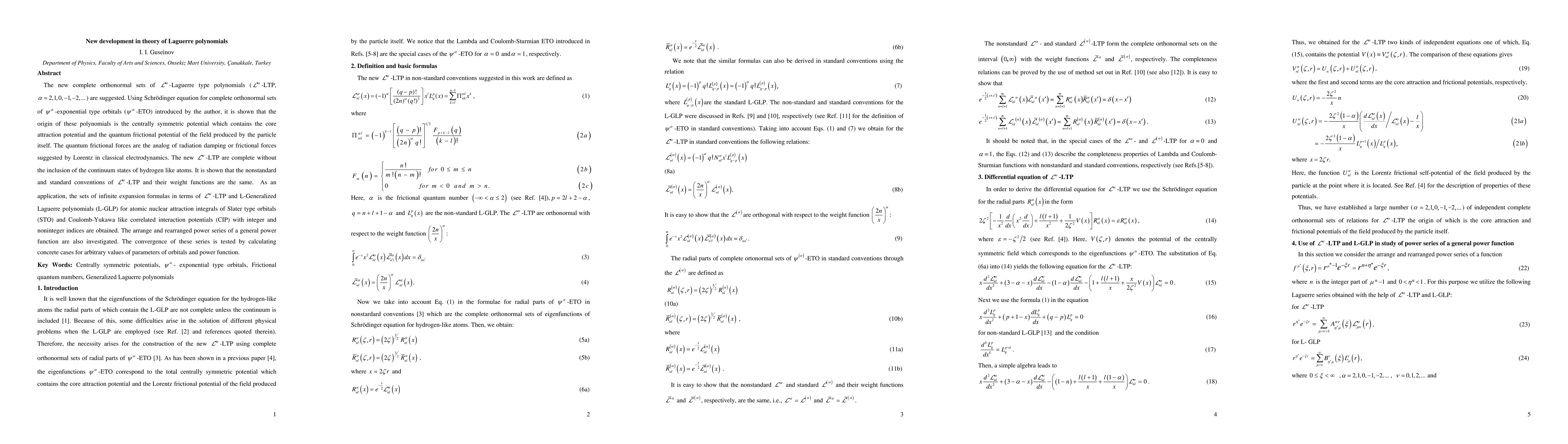 The new complete orthonormal sets of -Laguerre type polynomials (-LTP,) are suggested. Using Schr\"odinger equation for complete orthonormal sets of -exponential type orbitals (-ETO) introduced by the author, it is shown that the origin of these polynomials is the centrally symmetric potential which contains the core attraction potential and the quantum frictional potential of the field produced by the particle itself. The quantum frictional forces are the analog of radiation damping or frictional forces suggested by Lorentz in classical electrodynamics. The new -LTP are complete without the inclusion of the continuum states of hydrogen like atoms. It is shown that the nonstandard and standard conventions of -LTP and their weight functions are the same. As an application, the sets of infinite expansion formulas in terms of -LTP and L-Generalized Laguerre polynomials (L-GLP) for atomic nuclear attraction integrals of Slater type orbitals (STO) and Coulomb-Yukawa like correlated interaction potentials (CIP) with integer and noninteger indices are obtained. The arrange and rearranged power series of a general power function are also investigated. The convergence of these series is tested by calculating concrete cases for arbitrary values of parameters of orbitals and power function.
