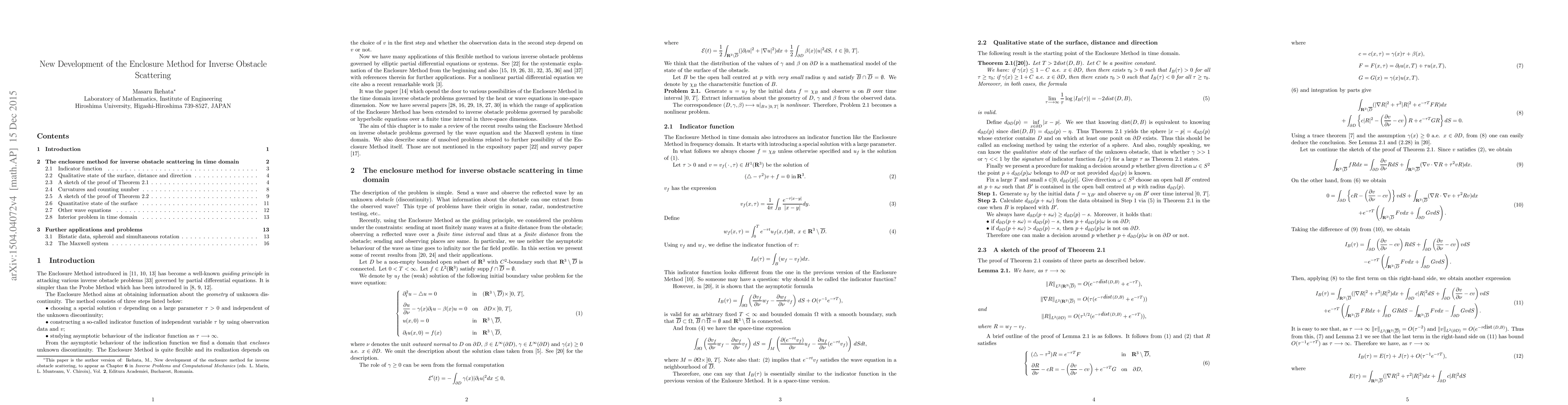 This paper reviews recent advancements in the Enclosure Method for solving inverse obstacle scattering problems governed by wave and Maxwell equations. It also highlights some unresolved issues and potential future directions for the Enclosure Method.