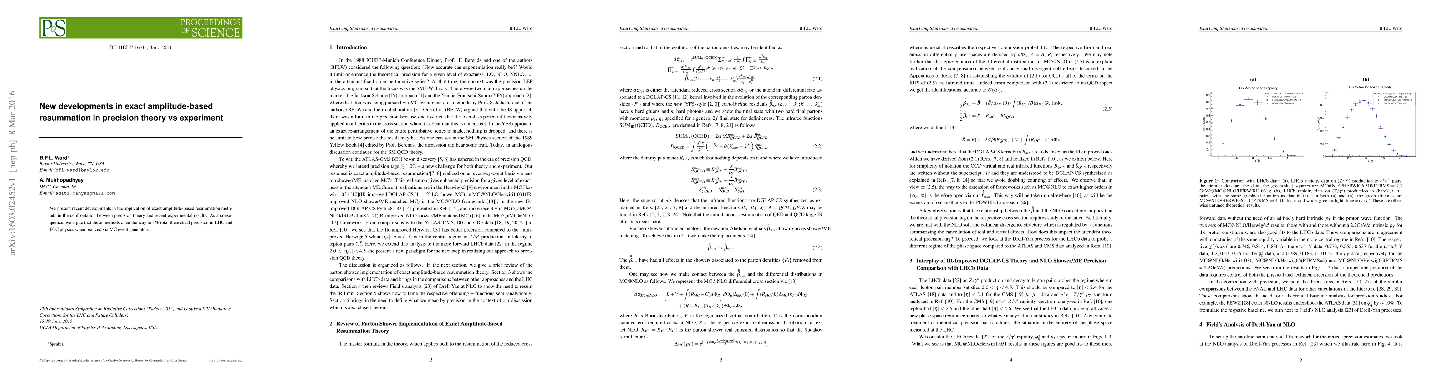 We present recent developments in the application of exact amplitude-based resummation methods in the confrontation between precision theory and recent experimental results. As a consequence, we argue that these methods open the way to 1\% total theoretical precision in LHC and FCC physics when realized via MC event generators.