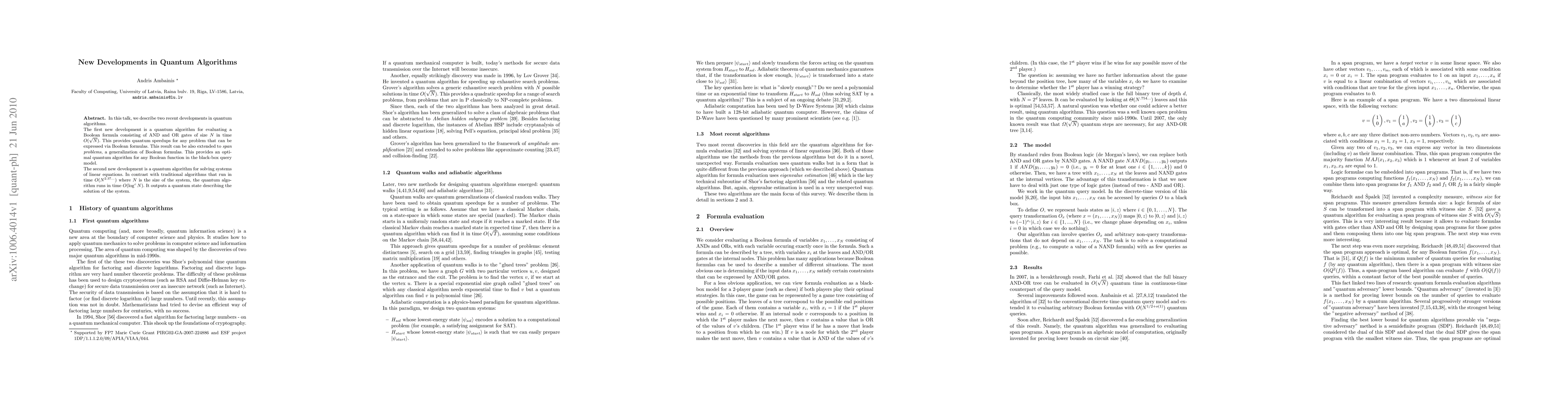 In this survey, we describe two recent developments in quantum algorithms. The first new development is a quantum algorithm for evaluating a Boolean formula consisting of AND and OR gates of size N in time O(\sqrt{N}). This provides quantum speedups for any problem that can be expressed via Boolean formulas. This result can be also extended to span problems, a generalization of Boolean formulas. This provides an optimal quantum algorithm for any Boolean function in the black-box query model. The second new development is a quantum algorithm for solving systems of linear equations. In contrast with traditional algorithms that run in time O(N^{2.37...}) where N is the size of the system, the quantum algorithm runs in time O(\log^c N). It outputs a quantum state describing the solution of the system.