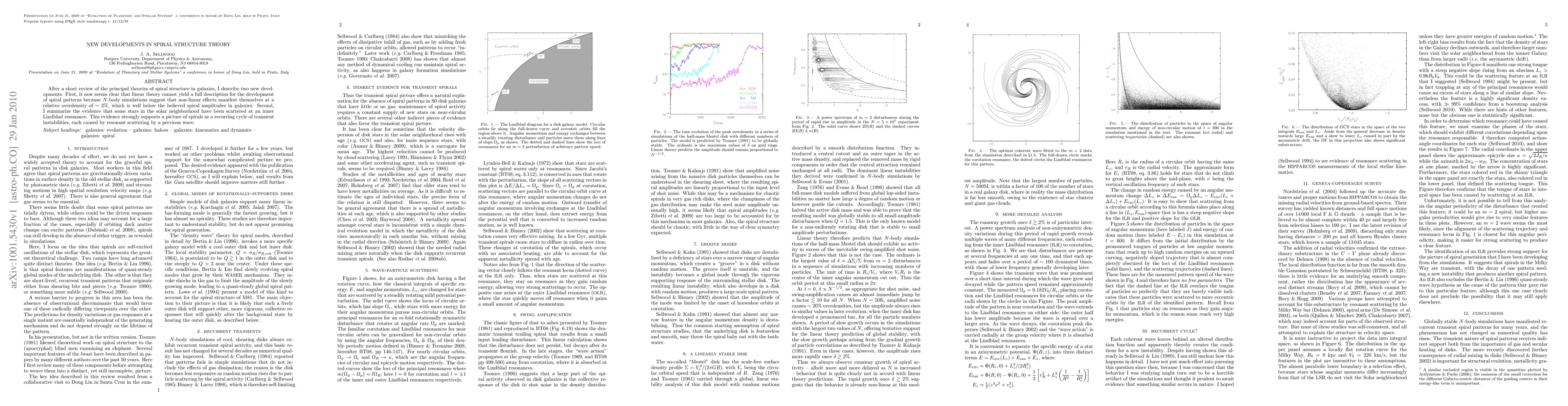 This paper reviews spiral structure theories in galaxies and highlights two new developments: non-linear effects are significant at lower densities than previously thought, and evidence supports spirals as transient instabilities caused by resonant scattering at inner Lindblad resonances.