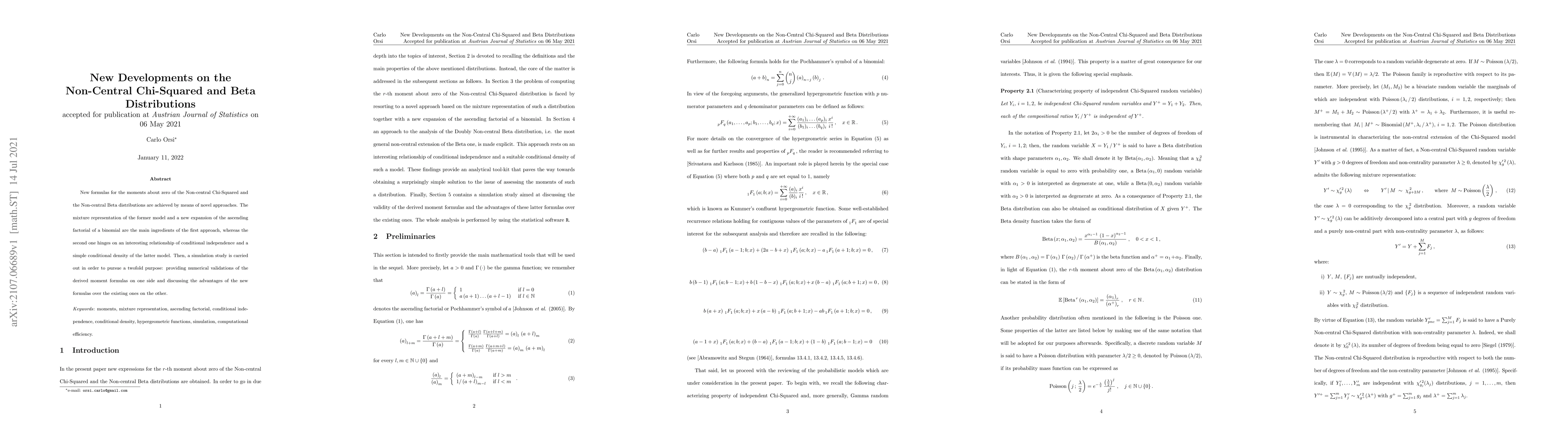 This paper introduces new formulas for the moments about zero of the Non-central Chi-Squared and Non-central Beta distributions using innovative methods, including mixture representations and a novel expansion technique. A simulation study validates the new formulas and highlights their advantages over existing methods.