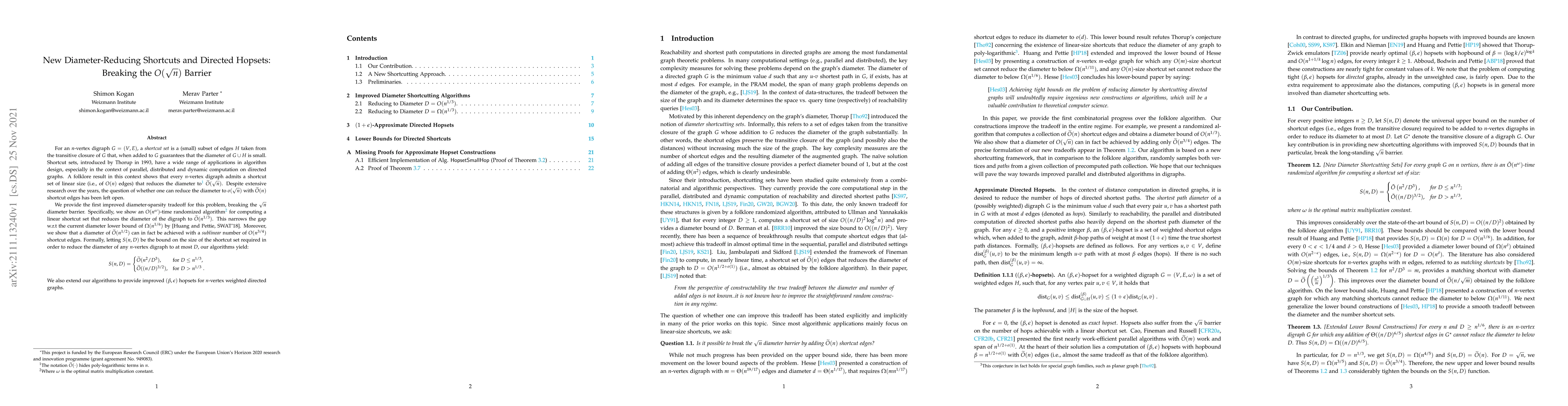 Researchers developed an algorithm to reduce the diameter of a directed graph with $O(n^{1/3})$ edges, breaking the $ ilde{O}(rac{n}{ ext{ } ext{π}})$ barrier, and showed that a smaller number of edges can achieve a diameter of $ ilde{O}(n^{1/2})$.