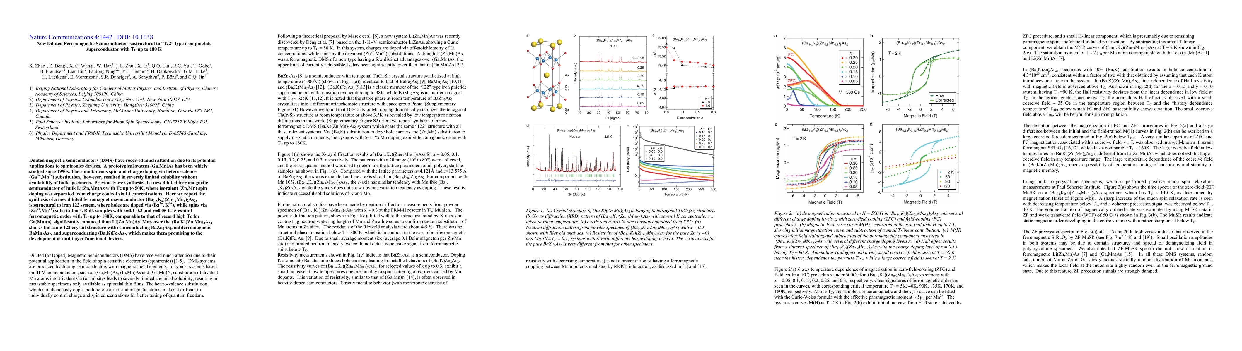This paper reports the synthesis of a new diluted ferromagnetic semiconductor (Ba1-xKx)(Zn1-yMny)2As2 with TC up to 180 K, significantly enhancing the critical temperature compared to previous Li(Zn,Mn)As systems. The material maintains the 122 crystal structure, promising for multilayer functional devices in spintronics.