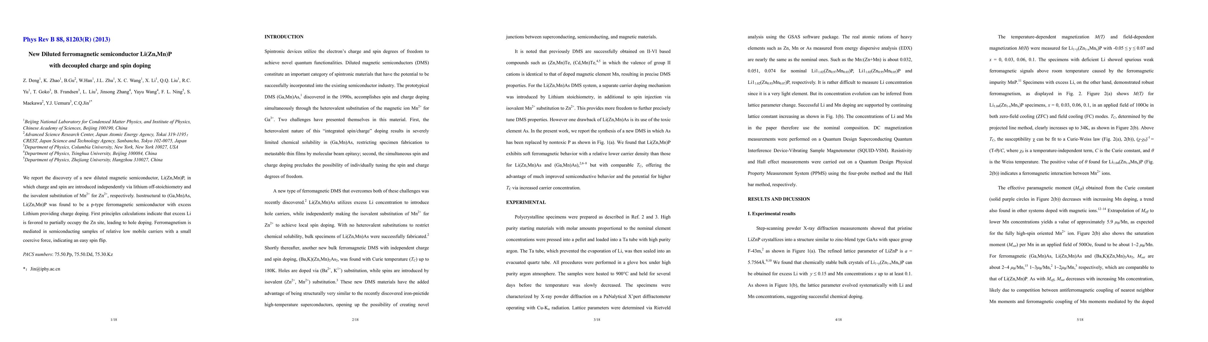 We report the discovery of a new diluted magnetic semiconductor, Li(Zn,Mn)P, in which charge and spin are introduced independently via lithium off-stoichiometry and the isovalent substitution of Mn2+ for Zn2+, respectively. Isostructural to (Ga,Mn)As, Li(Zn,Mn)P was found to be a p-type ferromagnetic semiconductor with excess Lithium providing charge doping. First principles calculations indicate that excess Li is favored to partially occupy the Zn site, leading to hole doping. Ferromagnetism is mediated in semiconducting samples of relative low mobile carriers with a small coercive force, indicating an easy spin flip.