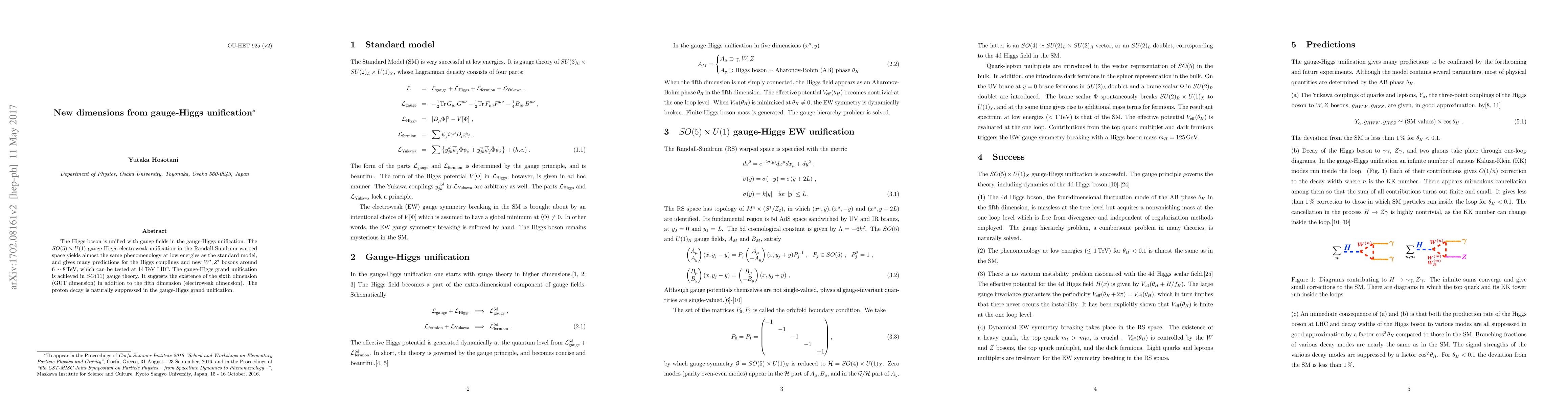 The Higgs boson is unified with gauge fields in the gauge-Higgs unification. The $SO(5) \times U(1)$ gauge-Higgs electroweak unification in the Randall-Sundrum warped space yields almost the same phenomenology at low energies as the standard model, and gives many predictions for the Higgs couplings and new $W', Z'$ bosons around $6 \sim 8$ TeV, which can be tested at 14 TeV LHC. The gauge-Higgs grand unification is achieved in $SO(11)$ gauge theory. It suggests the existence of the sixth dimension (GUT dimension) in addition to the fifth dimension (electroweak dimension). The proton decay is naturally suppressed in the gauge-Higgs grand unification.