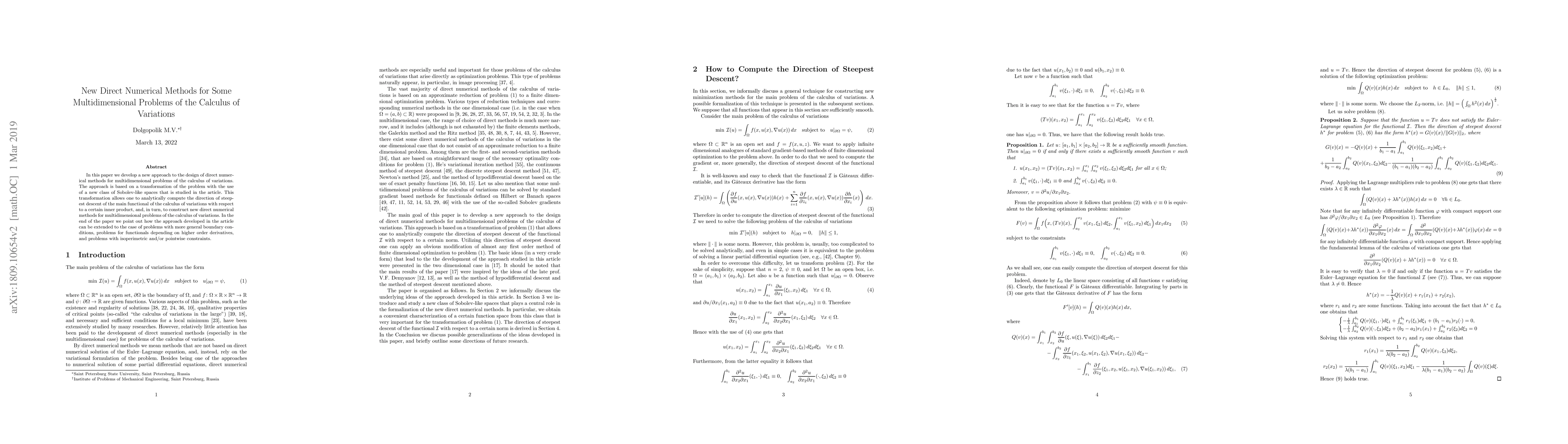 This paper introduces a novel approach to designing direct numerical methods for multidimensional calculus of variations problems using a transformation based on a new class of Sobolev-like spaces. The method analytically computes the steepest descent direction and extends to more general boundary conditions and higher-order derivatives.