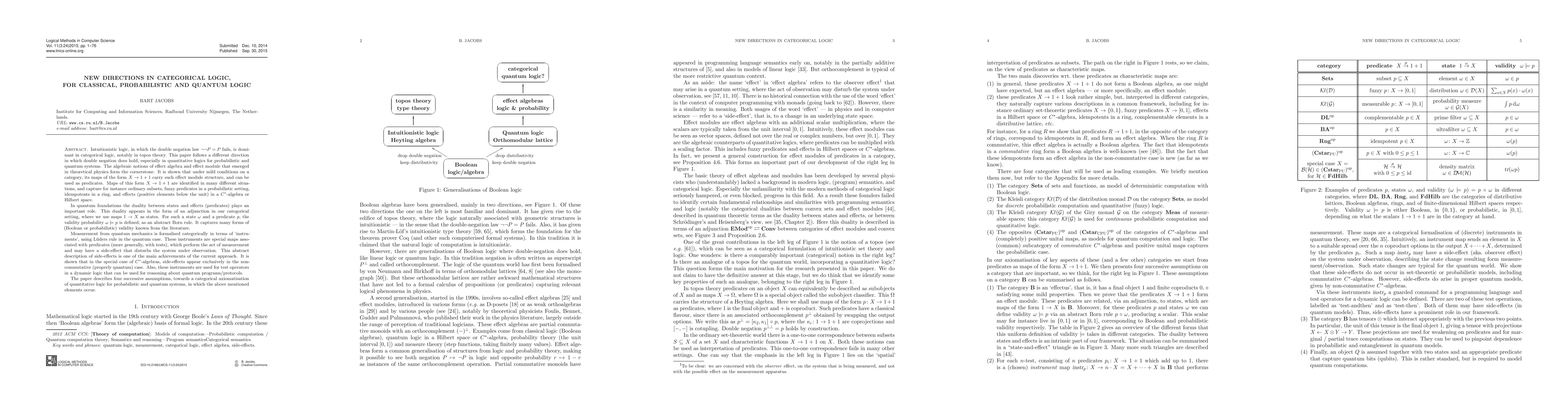Intuitionistic logic, in which the double negation law not-not-P = P fails, is dominant in categorical logic, notably in topos theory. This paper follows a different direction in which double negation does hold. The algebraic notions of effect algebra/module that emerged in theoretical physics form the cornerstone. It is shown that under mild conditions on a category, its maps of the form X -> 1+1 carry such effect module structure, and can be used as predicates. Predicates are identified in many different situations, and capture for instance ordinary subsets, fuzzy predicates in a probabilistic setting, idempotents in a ring, and effects (positive elements below the unit) in a C*-algebra or Hilbert space. In quantum foundations the duality between states and effects plays an important role. It appears here in the form of an adjunction, where we use maps 1 -> X as states. For such a state s and a predicate p, the validity probability s |= p is defined, as an abstract Born rule. It captures many forms of (Boolean or probabilistic) validity known from the literature. Measurement from quantum mechanics is formalised categorically in terms of `instruments', using L\"uders rule in the quantum case. These instruments are special maps associated with predicates (more generally, with tests), which perform the act of measurement and may have a side-effect that disturbs the system under observation. This abstract description of side-effects is one of the main achievements of the current approach. It is shown that in the special case of C*-algebras, side-effect appear exclusively in the non-commutative case. Also, these instruments are used for test operators in a dynamic logic that can be used for reasoning about quantum programs/protocols. The paper describes four successive assumptions, towards a categorical axiomatisation of quantitative logic for probabilistic and quantum systems.