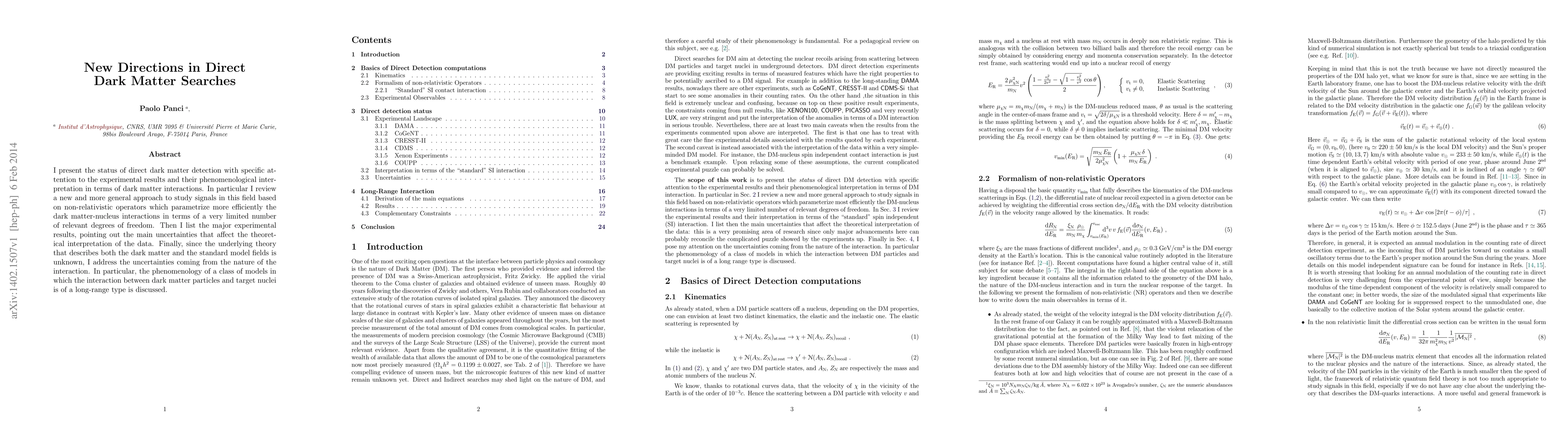 I present the status of direct dark matter detection with specific attention to the experimental results and their phenomenological interpretation in terms of dark matter interactions. In particular I review a new and more general approach to study signals in this field based on non-relativistic operators which parametrize more efficiently the dark matter-nucleus interactions in terms of a very limited number of relevant degrees of freedom. Then I list the major experimental results, pointing out the main uncertainties that affect the theoretical interpretation of the data. Finally, since the underlying theory that describes both the dark matter and the standard model fields is unknown, I address the uncertainties coming from the nature of the interaction. In particular, the phenomenology of a class of models in which the interaction between dark matter particles and target nuclei is of a long-range type is discussed.