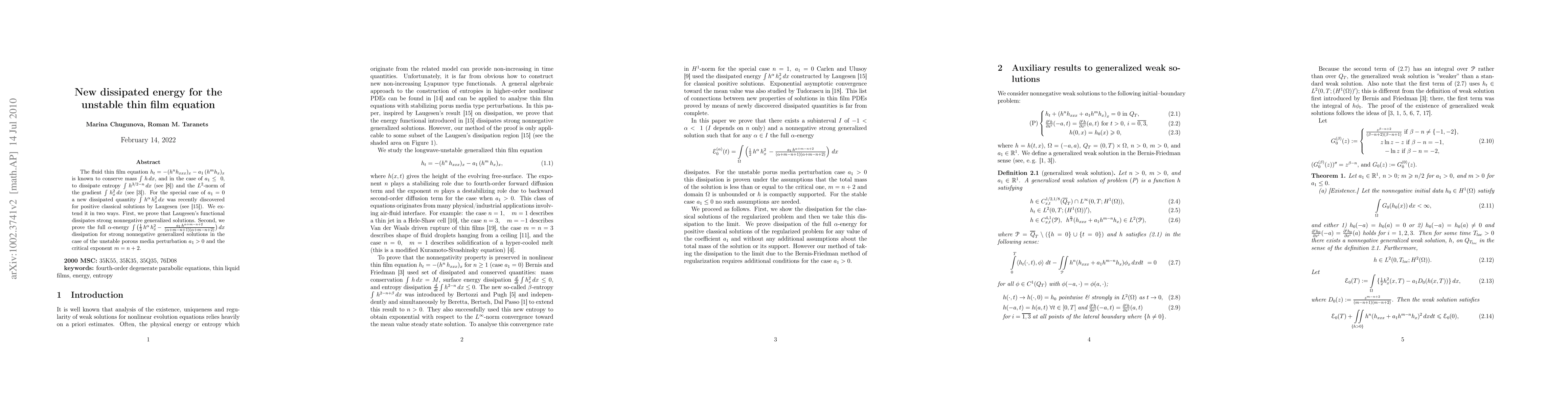 The fluid thin film equation $h_t = - (h^n h_{xxx})_x - a_1\,(h^m h_x)_x$ is known to conserve mass $\int\,h \, dx$, and in the case of $a_1 \leq 0$, to dissipate entropy $\int\,h^{3/2 - n}\,dx$ (see [8]) and the $L^2$-norm of the gradient $\int\,h_x^2\,dx$ (see [3]). For the special case of $a_1 = 0$ a new dissipated quantity $\int\, h^{\alpha}\,h_x^2\,dx $ was recently discovered for positive classical solutions by Laugesen (see [15]). We extend it in two ways. First, we prove that Laugesen's functional dissipates strong nonnegative generalized solutions. Second, we prove the full $\alpha$-energy $\int\,\bigl(\frac{1}{2} \,h^\alpha \, h_x^2\, - \frac{a_1\,h^{\alpha + m - n + 2}}{(\alpha + m - n + 1)(\alpha + m - n + 2)} \bigr)\, dx $ dissipation for strong nonnegative generalized solutions in the case of the unstable porous media perturbation $a_1> 0$ and the critical exponent $m = n+2$.
