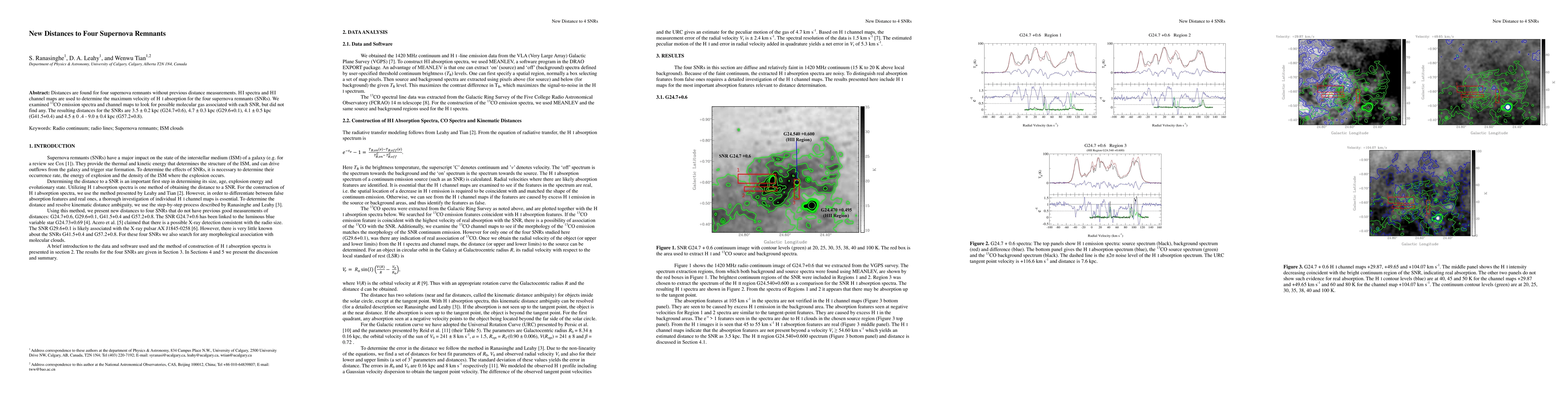 Researchers have measured distances to four supernova remnants using H I absorption spectra, providing new data for these cosmic events. The distances range from 3.5 to 9.0 kpc.