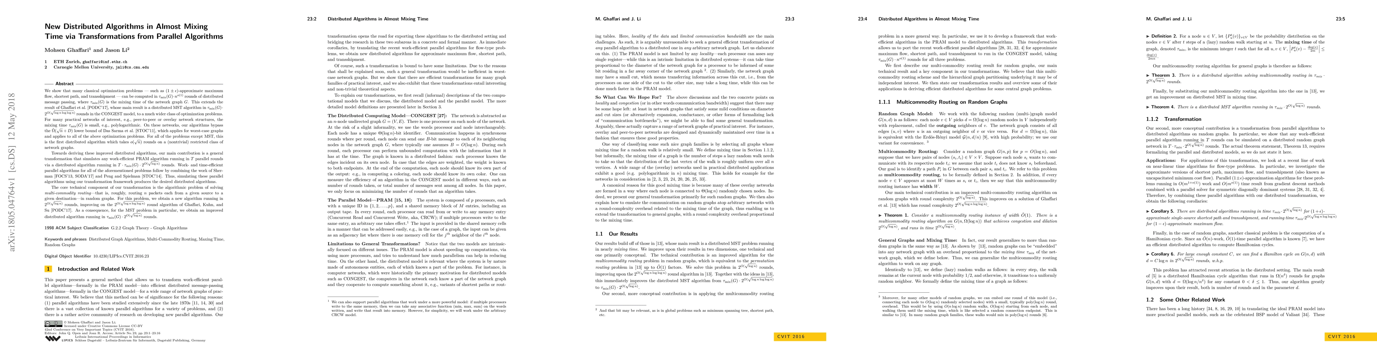 We show that many classical optimization problems --- such as $(1\pm\epsilon)$-approximate maximum flow, shortest path, and transshipment --- can be computed in $\newcommand{\tmix}{{\tau_{\text{mix}}}}\tmix(G)\cdot n^{o(1)}$ rounds of distributed message passing, where $\tmix(G)$ is the mixing time of the network graph $G$. This extends the result of Ghaffari et al.\ [PODC'17], whose main result is a distributed MST algorithm in $\tmix(G)\cdot 2^{O(\sqrt{\log n \log\log n})}$ rounds in the CONGEST model, to a much wider class of optimization problems. For many practical networks of interest, e.g., peer-to-peer or overlay network structures, the mixing time $\tmix(G)$ is small, e.g., polylogarithmic. On these networks, our algorithms bypass the $\tilde\Omega(\sqrt n+D)$ lower bound of Das Sarma et al.\ [STOC'11], which applies for worst-case graphs and applies to all of the above optimization problems. For all of the problems except MST, this is the first distributed algorithm which takes $o(\sqrt n)$ rounds on a (nontrivial) restricted class of network graphs. Towards deriving these improved distributed algorithms, our main contribution is a general transformation that simulates any work-efficient PRAM algorithm running in $T$ parallel rounds via a distributed algorithm running in $T\cdot \tmix(G)\cdot 2^{O(\sqrt{\log n})}$ rounds. Work- and time-efficient parallel algorithms for all of the aforementioned problems follow by combining the work of Sherman [FOCS'13, SODA'17] and Peng and Spielman [STOC'14]. Thus, simulating these parallel algorithms using our transformation framework produces the desired distributed algorithms. The core technical component of our transformation is the algorithmic problem of solving \emph{multi-commodity routing}---that is, roughly, routing $n$ packets each from a given source to a given destination---in random graphs. For this problem, we obtain a...