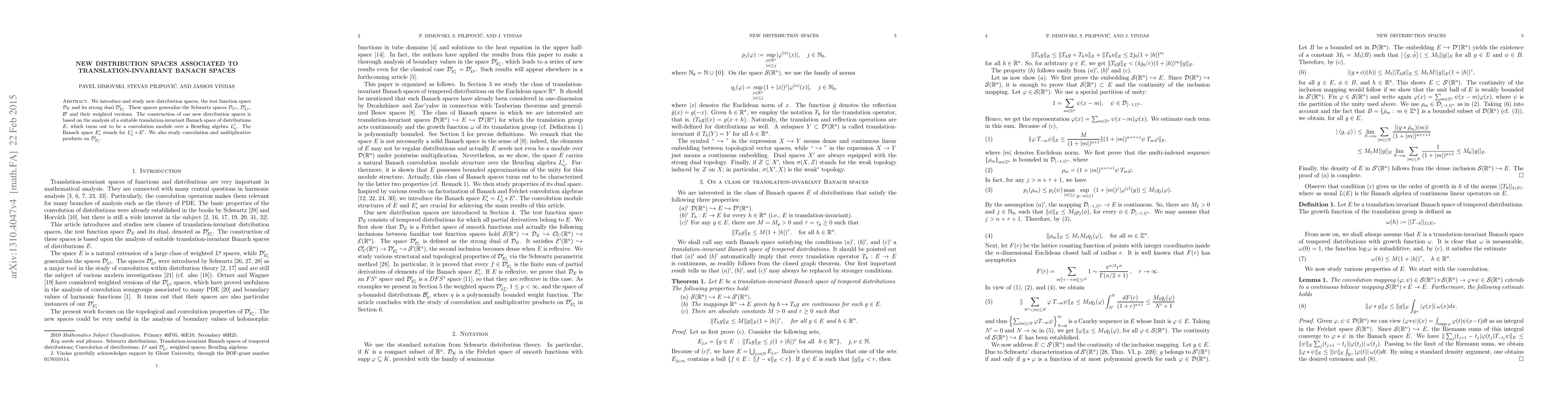 This paper introduces new distribution spaces $\mathcal{D}_E$ and $\mathcal{D}'_{E'_{\ast}}$, generalizing Schwartz spaces, based on a translation-invariant Banach space $E$ with continuous translation group. It also explores convolution and multiplicative products in $\mathcal{D}'_{E'_{\ast}}$.