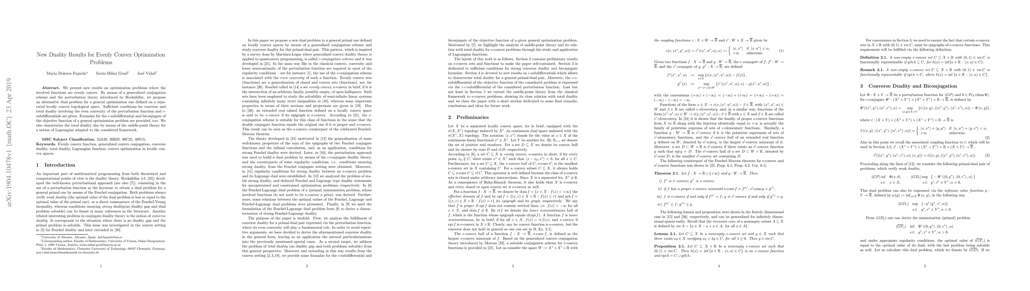This paper introduces new duality results for optimization problems involving evenly convex functions. It proposes an alternative dual problem using a generalized conjugation scheme and perturbation theory, providing sufficient conditions for converse and total duality with the involvement of $c$-subdifferentials and saddle-point theory.