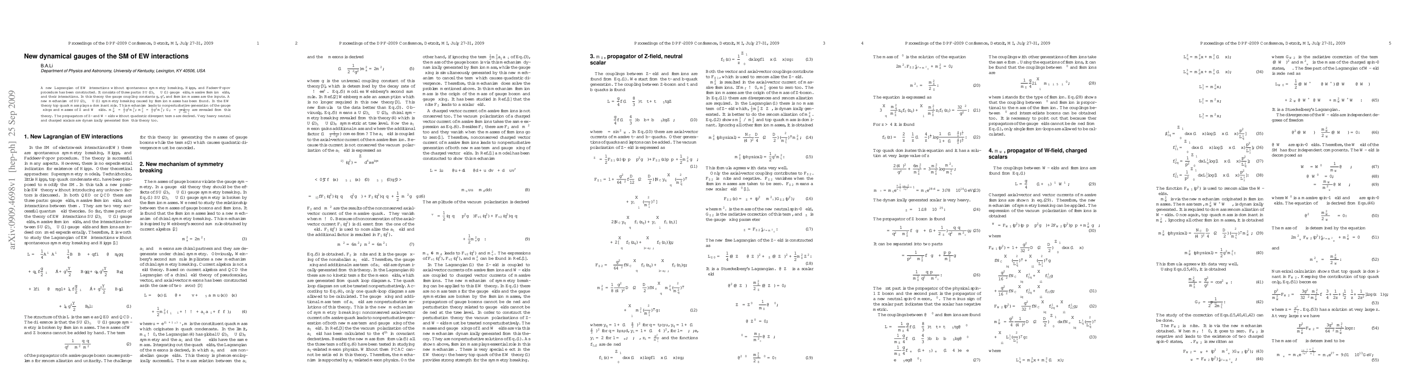 A new Lagrangian of EW interactions without spontaneous symmetry breaking, Higgs, and Fadeev-Popov procedure has been constructed. It consists of three parts: $SU(2)_L\times U(1)$ gauge fields, massive fermion fields, and their interactions. In this theory the gauge coupling constants g, g', and fermion masses are the inputs. A new mechanism of $SU(2)_L\times U(1)$ symmetry breaking caused by fermion masses has been found. In the EW theory top quark mass plays a dominant role. This mechanism leads to nonperturbative generation of the gauge fixings and masses of Z and W fields. $m^2_W={1\over2}g^2 m^2_t, m^2_Z={1\over2}\bar{g}^2 m^2_t, G_F=\frac{1}{2\sqrt{2}m^2_t}$ are revealed from this theory. The propagators of Z- and W-fields without quadratic divergent terms are derived. Very heavy neutral and charged scalars are dynamically generated from this theory too.