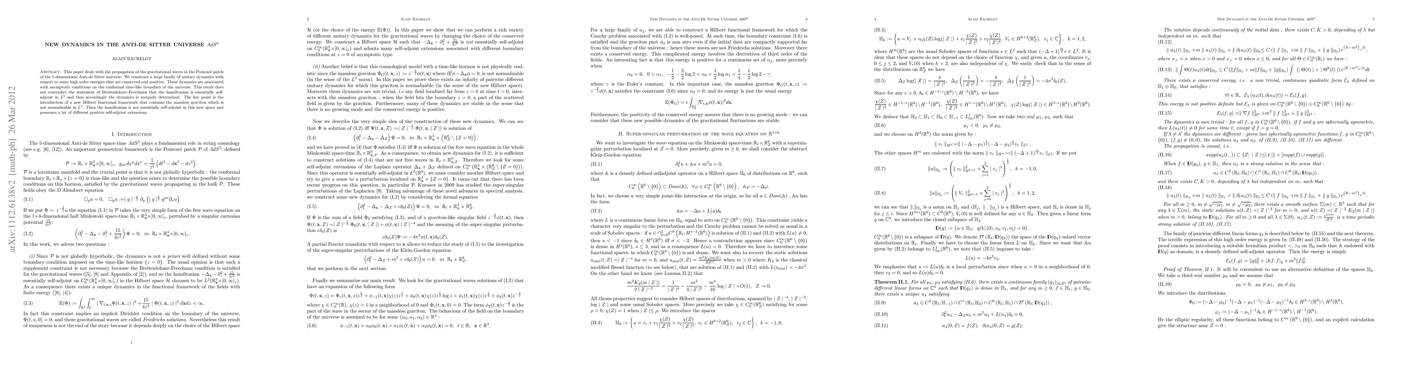 This paper deals with the propagation of the gravitational waves in the Poincar\'e patch of the 5-dimensional Anti-de Sitter universe. We construct a large family of unitary dynamics with respect to some high order energies that are conserved and positive. These dynamics are associated with asymptotic conditions on the conformal time-like boundary of the universe. This result does not contradict the statement of Breitenlohner-Freedman that the hamiltonian is essentially self-adjoint in L2 and thus accordingly the dynamics is uniquely determined. The key point is the introduction of a new Hilbert functional framework that contains the massless graviton which is not normalizable in L2. Then the hamiltonian is not essentially self-adjoint in this new space and admits a lot of positive self-adjoint extensions.