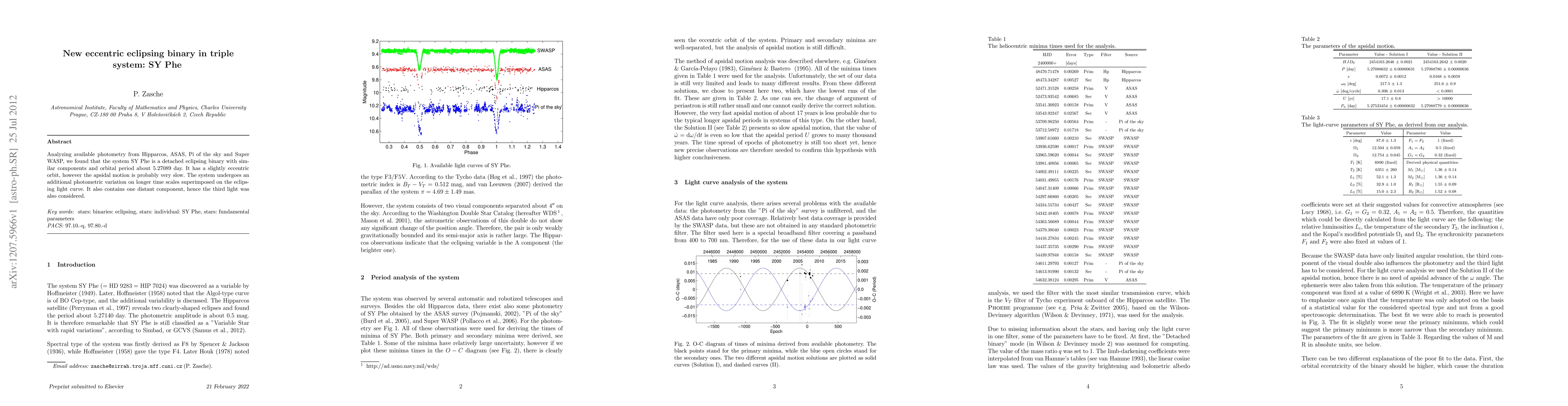 SY Phe is identified as a detached eclipsing binary with a 5.27089-day orbital period and slightly eccentric orbit, analyzed through multiple photometric datasets. The system exhibits additional long-term variations and includes a distant third component contributing to the third light effect.