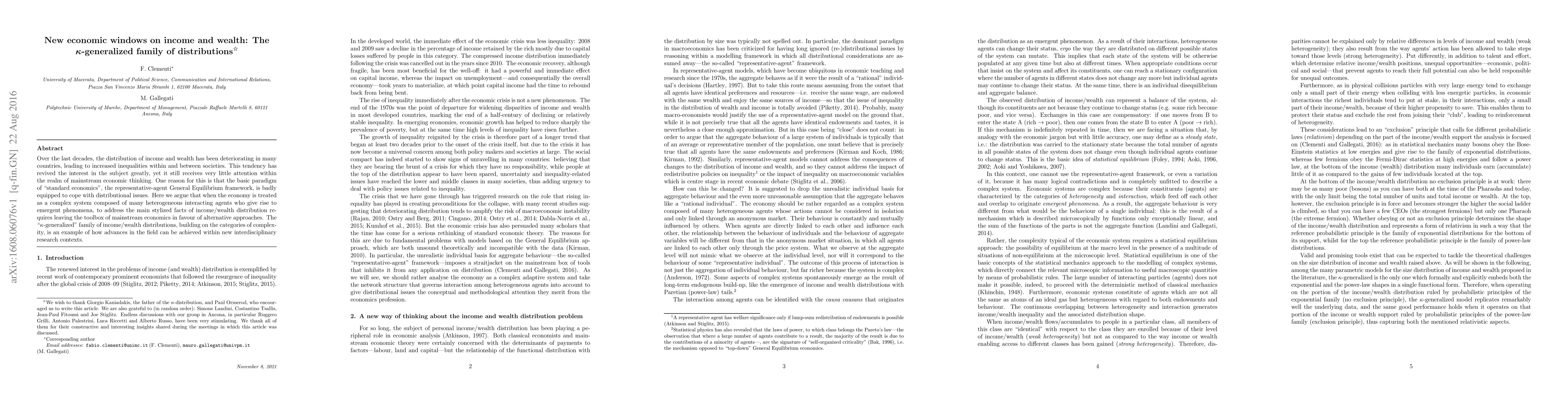 This paper discusses the deteriorating income and wealth distribution, emphasizing the need for alternative economic models beyond mainstream "standard economics." It proposes the "k-generalized" family of distributions as a new approach to address income and wealth inequalities, grounded in complexity theory and interdisciplinary research.