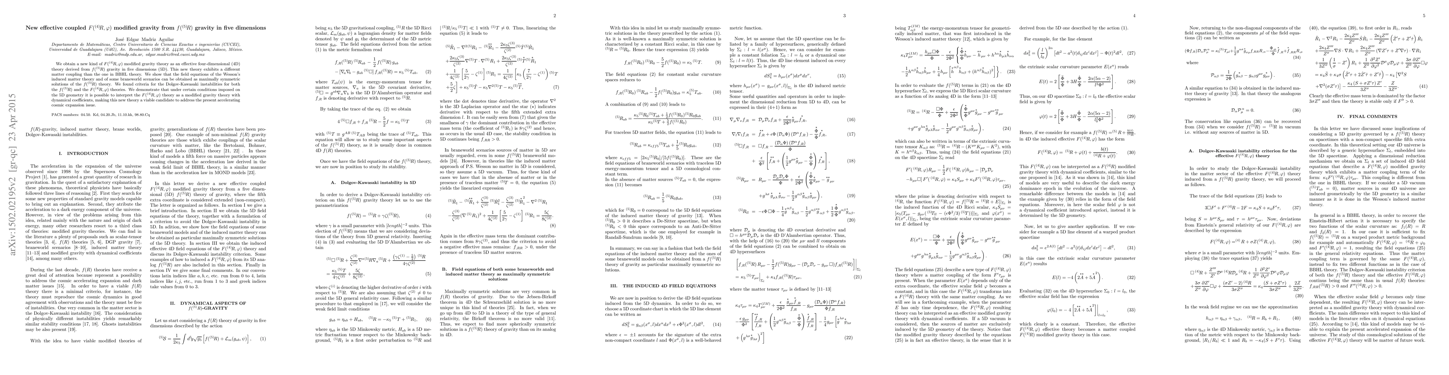 We obtain a new kind of $F(^{(4)}\!R,\varphi)$ modified gravity theory as an effective four-dimensional (4D) theory derived from $f(^{(5)}\!R)$ gravity in five dimensions (5D). This new theory exhibits a different matter coupling than the one in BBHL theory. We show that the field equations of the Wesson's induced matter theory and of some braneworld scenarios can be obtained as maximally symmetric solutions of the $f(^{(5)}\!R)$ theory. We found criteria for the Goldov-Kawasaki instabilities for both the $f(^{(5)}\!R)$ and the $F(^{(4)}\!R,\varphi)$ theories. We demonstrate that under certain conditions imposed on the 5D geometry it is possible to interpret the $F(^{(4)}\!R,\varphi)$ theory as a modified gravity theory with dynamical coefficients, making this new theory a viable candidate to address the present accelerating cosmic expansion issue.