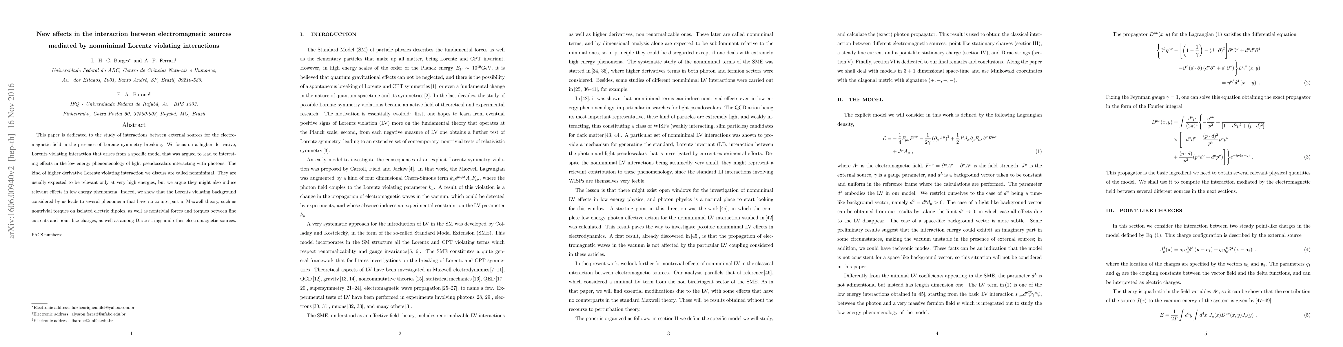 This paper investigates interactions between electromagnetic sources and photons in a scenario where Lorentz symmetry is broken, discovering new effects that occur at low energies. It focuses on nonminimal Lorentz violating interactions not seen in the Standard Model Extension.