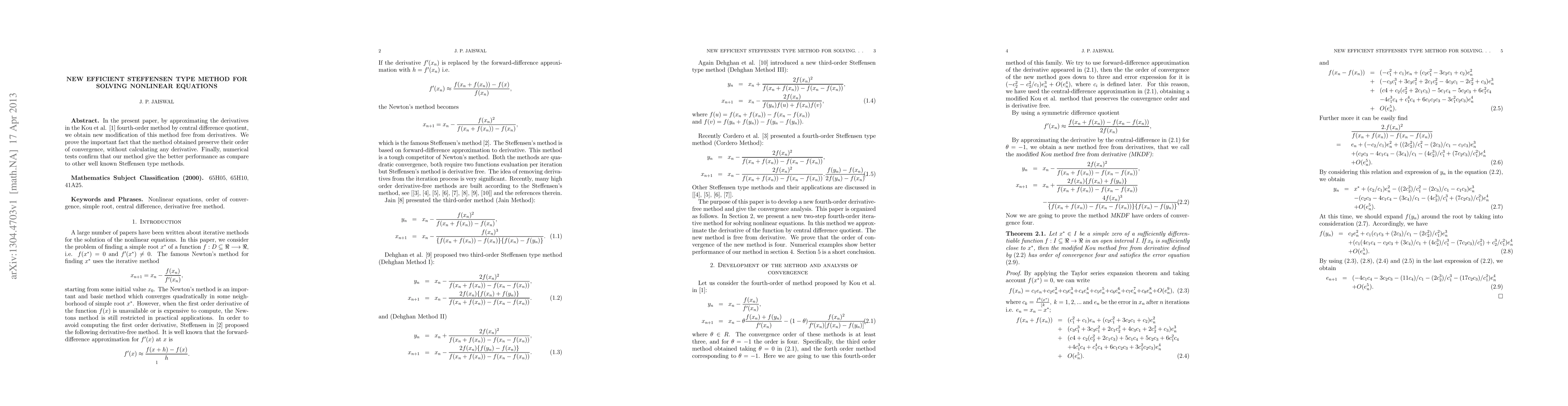 This paper introduces a new efficient method for solving nonlinear equations without calculating derivatives, preserving the order of convergence of existing Steffensen type methods.